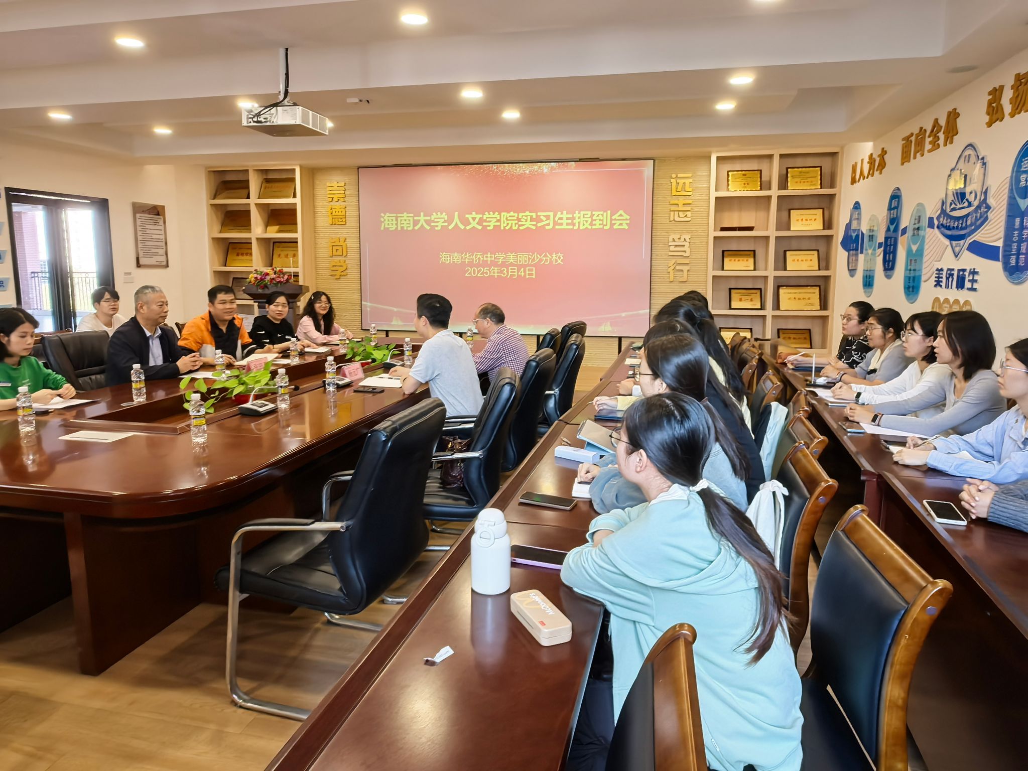 张田喜对学院领导、老师和实习学生的到来表示热烈欢迎,他简要介绍了美丽沙侨中近年来的发展情况,并指出美丽沙侨中的教师团队是一支年轻的队伍,希望同样作为年轻一代的同学们能够积极进取、砥砺前行,在实习中实现自我成长。办公室主任吴运磊介绍了学校的规章制度,并根据学生情况安排实习部门和指导老师,协调各部门工作。