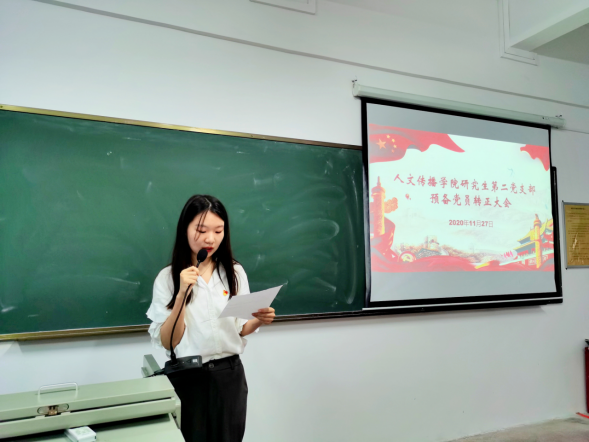 11月27日下午,人文传播学院研究生第二党支部在2教101教室召开预备党员转正大会,会议由党支部书记宋鸽主持。