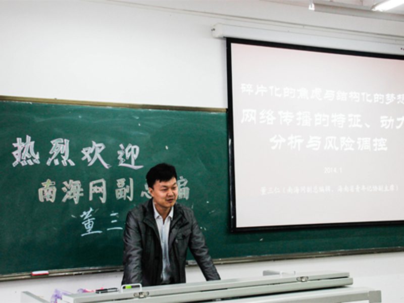 1月11日上午,人文传播学院新闻与传播学系冬季小学期第二期开课。主讲人董三仁进行了“碎片化的焦虑与结构化的梦想”的主题讲座。人文传播学院院长刘复生及全系师生出席了本次活动。 董三仁,南海网副总编辑、海南省青年记协副主席,海南省互联网界唯一中国新闻奖获得者。在讲座中,他围绕网络传播的特征、动力分析与风险调控为同学们提供了一次内容详实的讲座。凭借自身多年从业经验,详尽讲述了目前新闻生存的环境、网络传播的特征。并对舆论与传播的四冲程动力进行深入分析,拓展到网络舆论传播的使用理论,还探讨了网络舆论的风险调控原则与思路。董三仁指出,掌握网络传播的规律实质在于追求公共良序,最后他鼓励新一代媒体人能坚持新闻理想,并表达其良好祝愿。 董三仁用其诙谐幽默的言语、深度的思想感染了在座师生,课后与师生的互动轻松有趣,他用自身的渊博为同学们开拓眼界、增长见识,受到师生热烈欢迎与赞赏。 本次开班仪式由新闻与传播学系系主任何晶娇主持,刘复生院长为董三仁颁发聘书。 记者:于丽丽