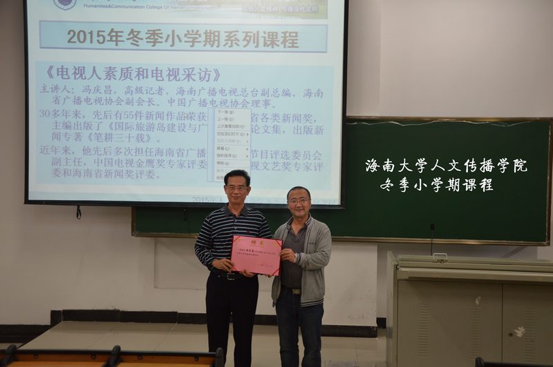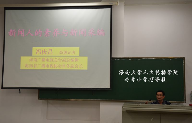 人文传播学院冬季小学期之《电视人素质及广播电视采访》课程在5教311开讲,主讲人为海南 广播电视总台副总编辑、中国广播电视协会理事冯庆昌老师。人文传播学院鞠斐教授为冯庆昌老师颁发聘书。 冯庆昌老师在课程中通过从事新闻行业30余年的经验心得,向在场师生介绍了中国当代新闻事业的侧重点和突出点,强调“坚持新闻的政治观”、“坚持新闻的导向观”、坚持新闻的真实观”、“坚持科学准确的监督观”、“坚持走转改工作”等重要方面。同时,他结合《65载看中国》等具体新闻片分析了广播电视吸引观众的基础和要点。 参加本次课程的刘同学说道:“本次课程内容贴近我们的专业学习。我们即将毕业,通过冯老师的讲座能够真正了解导自己的优势和不足,为以后的人生规划做好准备”。 据悉,冯庆昌老师从业30多年来,先后有55件新闻作品荣获全国和全省各类新闻奖,多次担任海南省广播电视优秀节目评选委员会副主任、中国电视金鹰奖专家评委、中国电视文艺奖专家评委等相关职务。