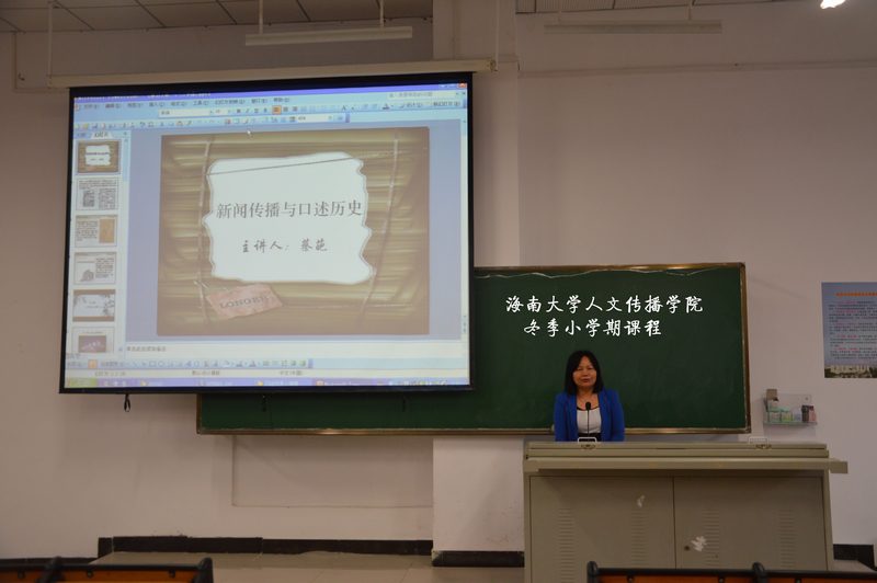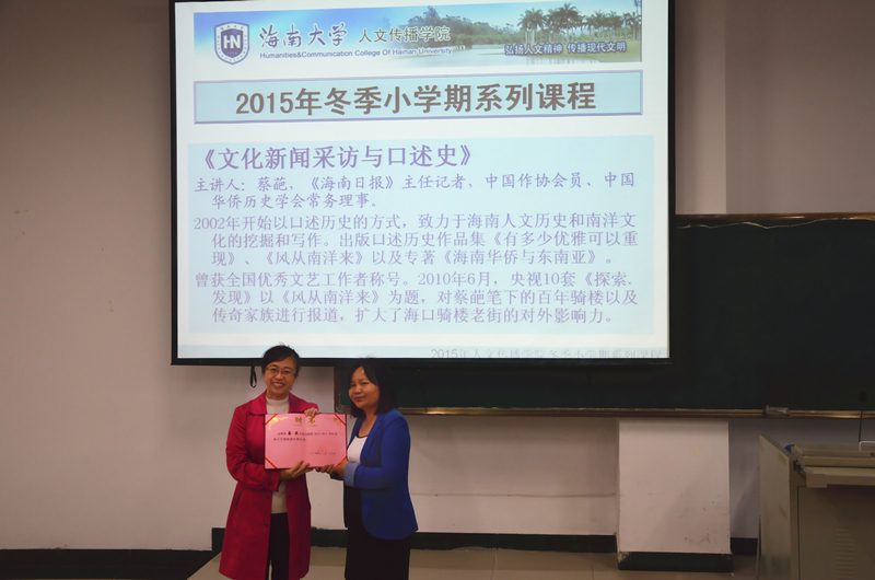 2015冬季小学期授课外聘专家”证书。 同学们对蔡葩老师的到来表示热烈欢迎,大家通过鞠斐老师的介绍了解到,蔡葩老师的历史随笔集《有多少优雅可以重现》、《找回南洋》。《国医出自海南岛》获第十三届海南省新闻评奖副刊一等奖,《格格遗事》获第十四届海南省新闻评奖副刊二等奖。 随后课堂上,蔡葩老师以诙谐幽默的讲课方式教授学生们在《口述历史》方面的知识。蔡葩老师曾在2002年采访过海口名媛吴玉琴、前清格格爱新觉罗?恒容、海岛留守女人等不下百名见证了海南历史兴衰的人物,尽管采访对象都是老人,但蔡葩老师有能力让他们对她掏心掏肺。本次授课以新闻采访专题片播放的形式娓娓道来。看似漫长的4节课,即将结束,总结本次课程蔡葩老师以3个篇章向学生详细介绍了她在口述历史时采访过程中的细节,万事开头难,蔡葩老师以自己独有的亲和力成为采访对象家庭中的一员;也包含着她对这些老人们经历的感慨和体悟。最后半个小时,蔡葩老师与同学互动答疑,女同做爱