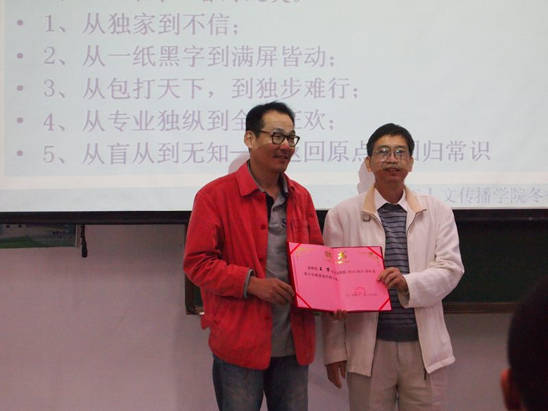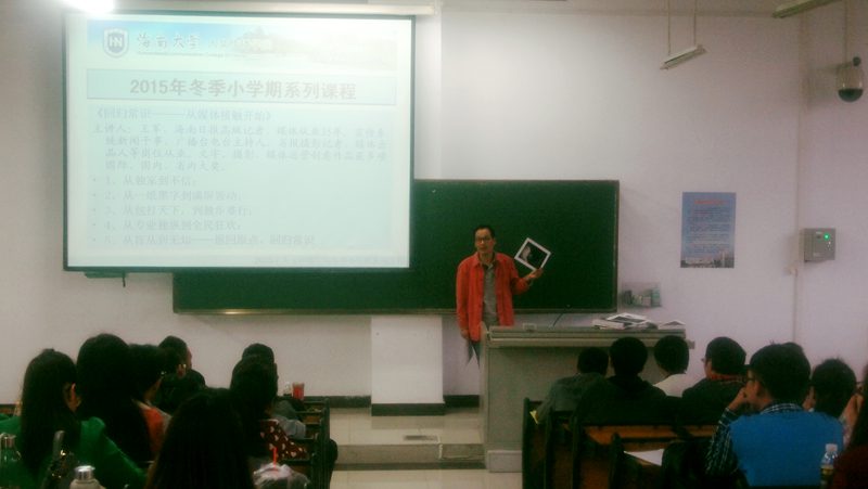 2015年1月8日上午八时,人文传播学院2012级新闻与传播学系冬季小学期正式开班。海南日报高级记者,具有35年媒体从业经验的王军老师走上讲台,为2012级新闻与传播学系同学们讲授了本届小学期首门课程《回归常识——从媒体接触开始》。人文传播学院党委书记王兆庆教授出席授课并致辞,新闻与传播学系主任何晶娇老师担任主持工作。 王军老师于宣传系统新闻干事、广播台电台主持人、省报摄影记者、媒体出品人等岗位从业,其文字、摄影、媒体运营创意作品获多项国际、国内、省内大奖,拥有丰富的理论和实践经验,深厚的专业背景。以一组“秀英儒显村百岁老人”的摄影图片为出发点,王军老师阐述了媒体信息采集时的目的性和咨询传播过程中传播者对受众的主动选择,深入浅出地指出个人在面对繁杂资讯时,要回归常识,避免被蒙蔽;媒体从业者传播信息时,也应充分尊重每个个体对信息的不同反应和不同声音。王军老师说:“相对于‘回望’表现出来的仪式感,‘回归’更能体现用‘常识’理解问题的理所当然。”随后,王军老师又以“如何向父母要零花钱”为例与同学们进行互动,生动鲜活地分析了一篇成功广告文案应当具备的要素。最后,同学们也就微信平台运营前景以及陕西手术台自拍事件向王军老师提问,并得到细致解答。 在短短三小时的交流活动中,王军老师渊博的学识、专业的解读和风趣幽默的谈吐使同学们获益匪浅。接下来的两周内,还将有女同做爱