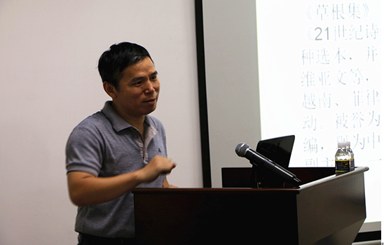 部分教师、研究生、本科生、诗歌爱好者参加了本次讲座。 李少君从“百年新诗”的源头1917年讲起,讲到1957年《诗刊》的创刊,有关新诗与中国现代性的关系的争论,诗歌的历史意义以及诗歌对于人心灵的慰藉作用等。他还将中国的诗教传统与西方的宗教传统作比较,认为“西方有圣经,中国有诗经”。在他看来,新诗是自由、进步的标志,新诗于中国的主要意义在于解放思想、革新文化。 李少君与师生们分享了他关于诗歌的最新思考成果——当代诗歌四十年。他将“当代诗歌四十年”分成了四个阶段:第一阶段是朦胧诗时期,这个时期是向外学习的阶段,翻译诗对于当代诗歌有重要意义;第二阶段是文学寻根时期,也是对内寻找传统的时期,值得注意的是这一时期余光中、郑愁予、洛夫等台湾现代诗人对中国大陆的影响;第三阶段为21世纪初的诗歌,也就是由李少君老师提出的“草根性”时期,这个阶段是向下挖掘的阶段,网络诗歌,地方诗歌,女性诗歌等崛起,新的创作机制、传播机制、评判机制、选择机制、编辑机制等都促使诗歌进入到一个相对大众化、民主化的时代。李老师预言,中国即将出现诗歌的第四个阶段——向上超越的阶段,在这个阶段将确立新的美学原则,创造新的美学形象,建立现代意义世界。讲到尽兴处,李少君朗诵起自己的两首诗——《致——》《抒怀》,感情真挚。李少君两个小时的讲座,给师生们带来的不仅有“诗意”,还有各种“意义”。 在总结发言环节,刘复生院长对李少君的讲座给予高度评价:“诗歌写作,从来都不只是关于个人的情感和内心的风景,当下诗坛的问题,在于诗人和评论家们过多的沉溺于细碎的个人经验,迷失在语词的丛林。而李少君一直以来关于诗歌的思考,总是和中国文化复兴的命运潜在相关,经由诗歌,他试图探索与追问的是中国文化建议的战略战术问题,这是值得我们重视和尊敬的。” (通讯员:胡杏)