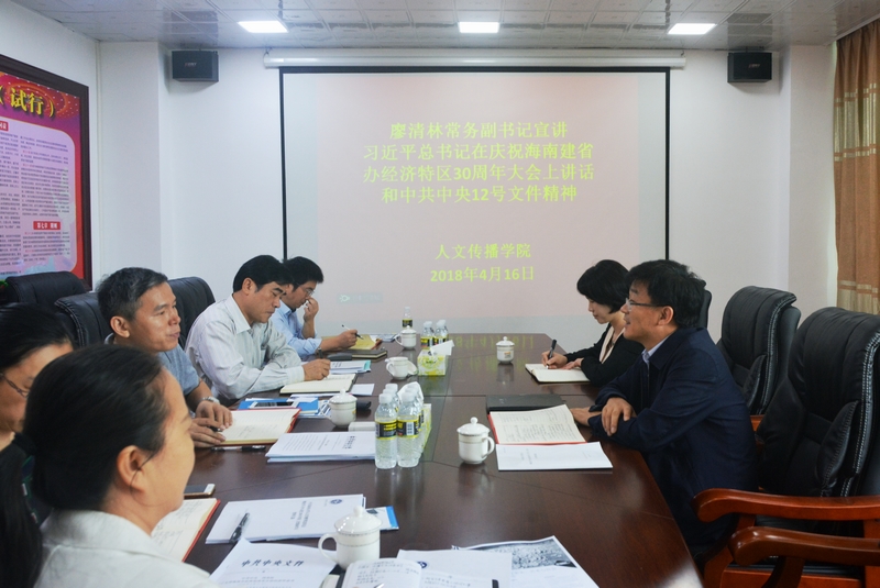 4月16日上午,校党委常务副书记廖清林在社科楼B615会议室向人文传播学院党政领导班子成员宣讲习近平总书记在庆祝海南建省办经济特区30周年大会上的讲话和《中共中央国务院关于支持海南全面深化改革开放的指导意见》精神,学校党委综治办主任何映敏参加会议。