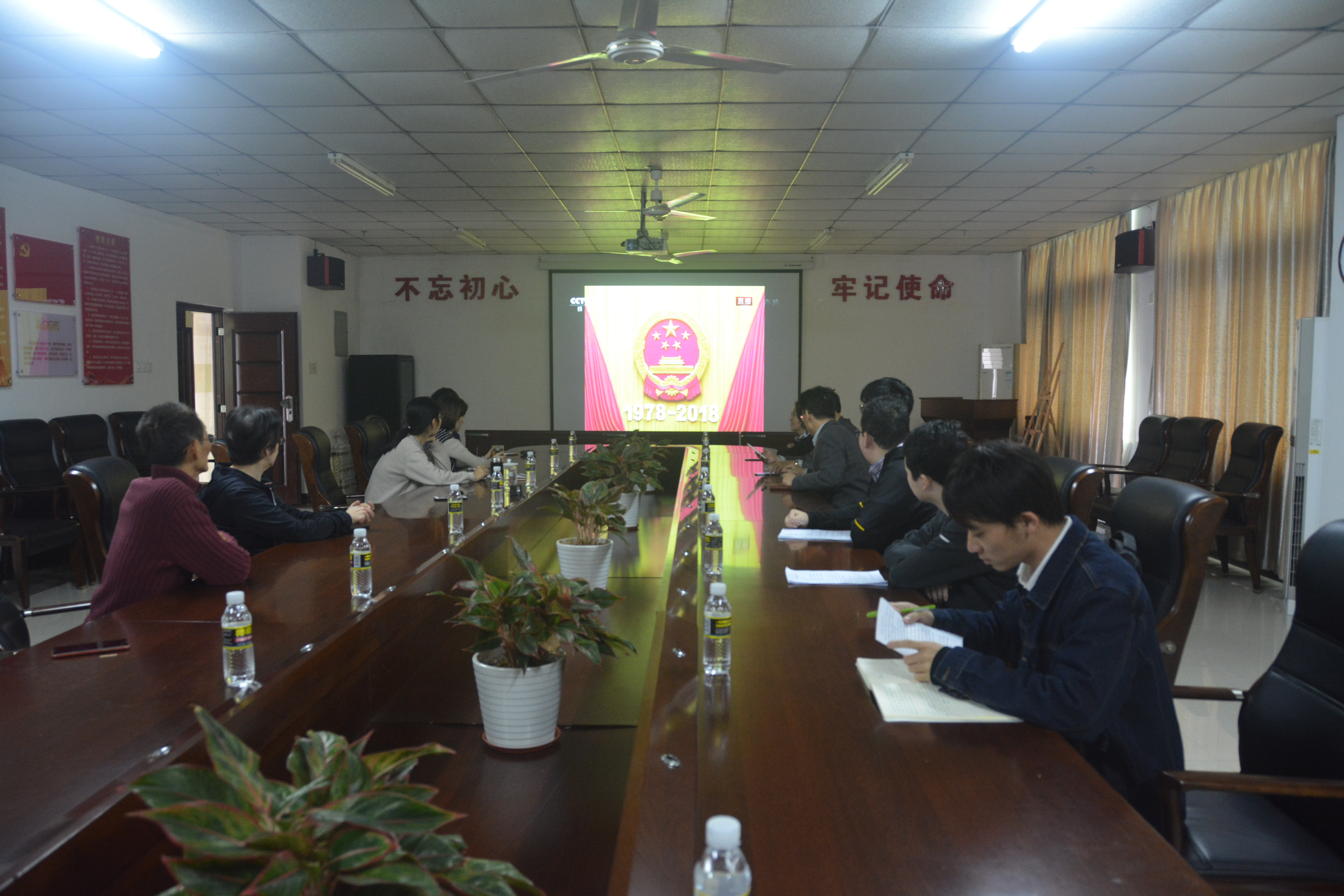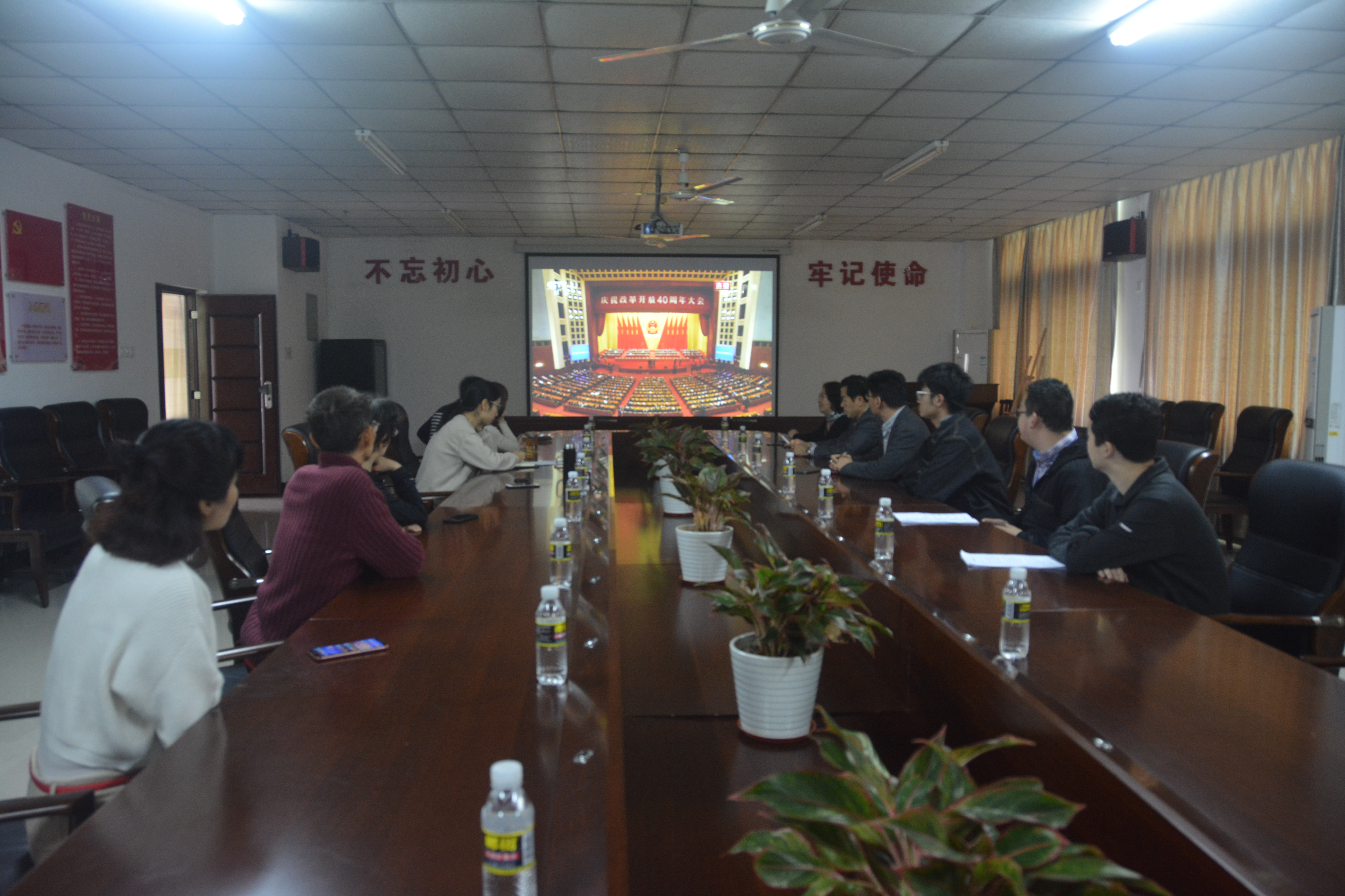 12月18日上午10时,人文传播学院党委书记华世佳、党委副书记孙晓媛,带领办公室坐班人员以及学生骨干在社科楼B719会议室收听看庆祝改革开放40周年大会实况。