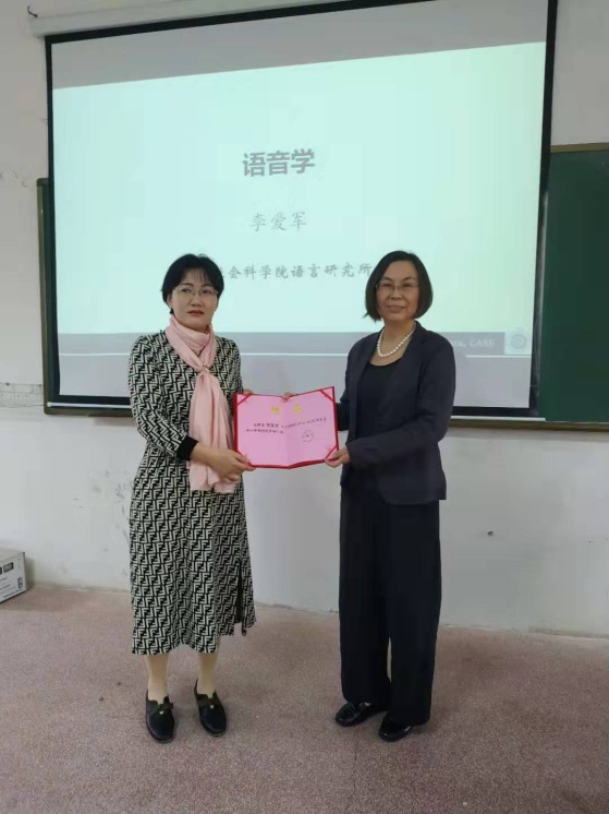 冬季小学期的课堂,以“情感语音的多模态跨文化研究”为主题为人文传播学院本科生授课。学院部分专业教师、研究生和本科生聆听了李老师的精彩报告。讲座开始时,文学院李彩霞副院长向李爱军老师颁发了冬季小学期授课外聘专家的聘书。