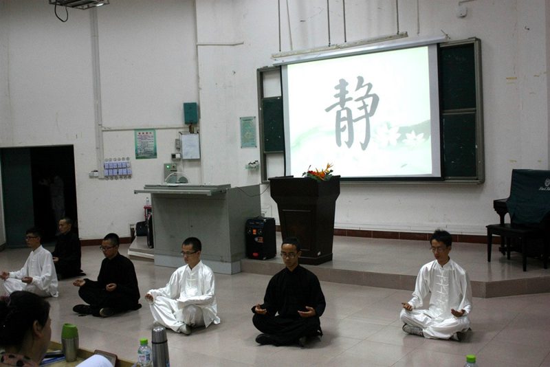 “前心后心皆此心,梵音妙音柔软音”,一曲清净无染而又憾人心灵的佛教音乐开启了本场讲座的序幕。在清远空阔的音乐声中,身着一袭白色太极拳服的杨国良教授带领女同做爱