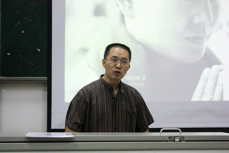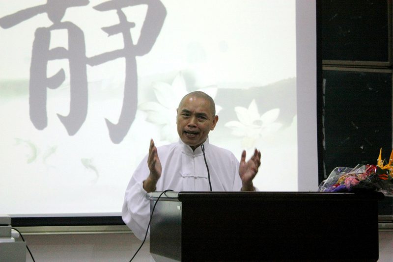 太极拳协会的几名同学于主讲台前与在场听众一起闭目静坐、聆听梵音、体悟心性。 本场讲座以音乐启,熊开发教授则也以音乐切入讲题。所播放的这段佛教音乐为尼泊尔著名佛教音乐唱咏者琼英•卓玛音乐集《宁静心》中的一支曲。熊开发教授说,佛讲求缘分,得遇听到这支曲子也靠的是一种缘分,这支曲子和《金刚经》经文义理内在非常相契。一般来说,音乐与潜伏在内、无法表达的情绪是呼应的,听音乐会让人焕然一新,心跟着开阔起来。这里播放的音乐,追求开悟的信念以慈悲穿透整首曲子,人人皆有佛性,悟者就是佛陀;而《金刚经》也正是一部教人“扫相破执”、“无相无住”,进而明心见性的一部佛学经典。熊开发教授联系东方经典系列讲座前面几期的内容指出:如果说第三讲张江南博士解读《维摩诘所说经》突出的是人的一种智性,第四讲李溢教授主讲泰戈尔突出的是人的神性,那么本讲的《金刚经》的解读则着力突出的是人的佛性。从人人皆有佛性来看,熊开发教授引用主张推行“人生佛教”的太虚法师的话指出,佛法非宗教也非哲学,佛教从根本意义上说是无神论的,佛祖释迦摩尼本就是一个拥有佛性的人,觉悟者即为佛。 在以下时间围绕《金刚经》的解读中,熊开发教授从一、译、注版本;二、慧能“金刚般若波罗蜜经序”解;三、经文选读;四、经句摘要;五、禅宗故事几个方面展开了系统讲解。这其中,慧能《金刚经解义》卷首的“金刚般若波罗蜜经序”贯穿了经文中的所有义理,对理解把握《金刚经》则有着通览的意义,同时对理解《金刚经》与禅宗的关系也有着重要意义。传说六祖慧能当年听人诵《金刚经》诵到“应无所住而生其心”而心即开悟,前往黄梅东禅寺参礼五祖弘忍,得传衣钵而创立南宗禅。在慧能的序解中,把《金刚经》定位于“无相为宗,无住为体,妙有为用”,为了现场听众更好的理解此话,熊开发教授围绕“无念”、“无相”、“无住”等佛学义理展开了细致阐发,同时也对《金刚经》全称《能断金刚般若波罗蜜经》中的佛学名词进行了详尽的讲解。熊开发教授细致入微的析理和拥有的丰富佛学知识,令在场听众击节称赏,不时爆发出热烈的掌声。
