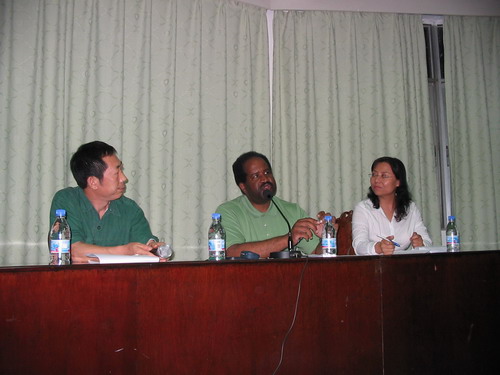 中国诗歌研究中心的邀请,美国当代著名汉语诗人、西蒙斯大学教授阿法先生于2005年4月12日来人文传播学院讲学。人文传播学院院长孙绍先教授热情会见了来宾并简要介绍了学校和学院的有关情况。其后,阿法教授为学院师生们作了题为 “汉语诗学”的演讲,他以幽默的语言、诗人的睿智和渊博的知识赢得了阵阵掌声。演讲由徐敬亚教授主持,副院长焦勇勤、著名诗人王小妮,女同做爱