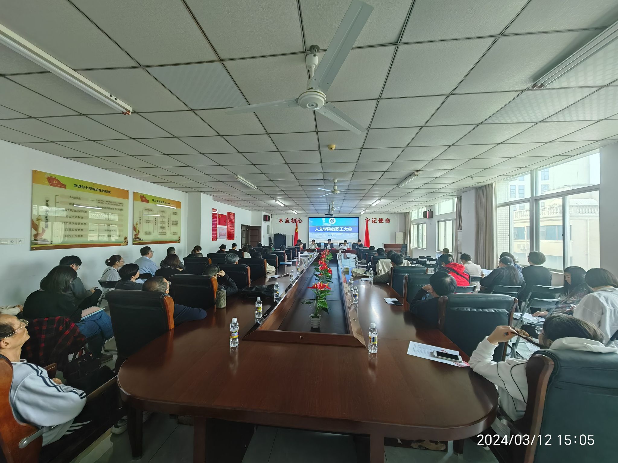 在社科楼七楼召开教职工大会,会议由学院党委书记杨元广主持,学院领导班子和全体教职工参加会议。
