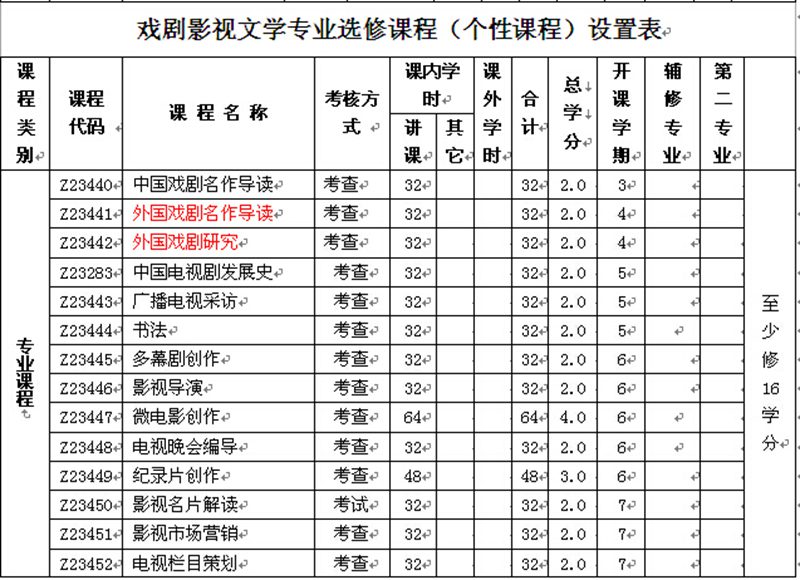 2013级各专业个性课程通选,学生可在各专业选修个性课程,学分有效。在2013级第4学期(2015.3-2015.7)将开设六门“个性课程”。因各专业第4学期公共课和必修课较多,故限定各专业学生选课数量上限为2门(中文专业学生已修8-11个学分,可以不选)。第5-7学期将开设较多个性课程(尤其戏影专业),届时同学们可根据需要选择适合自己的课程。(各专业课程体系学分分配情况及“个性课程”选择建议参见本网站《人文传播学院2013级各专业课程体系学分分配表》及说明。) 2013级第4学期将开设的个性课程详细情况为: