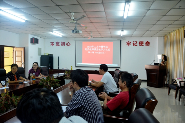 党员教师课堂教学大比武专项活动的通知》精神及要求,为了确保课堂成为学习贯彻习近平新时代中国特色社会主义思想的重要阵地,促进党员教师积极担负起立德树人的重任,充分发挥党员的先锋模范作用,提高学院课堂教学质量,通过“以赛代训”的形式提高党员教师课堂教学能力,人文传播学院于10月31日下午和11月1日上午在社科楼B719会议室分别开展了两场党员教师课堂教学大比武活动,学院党委书记华世佳、院长刘复生、副院长张硕果、李彩霞以及学院督导小组成员作为评委参加了此次大比武活动。