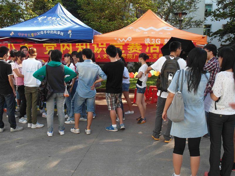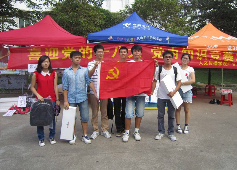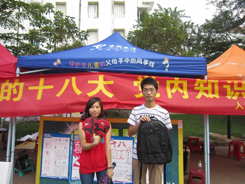 五食堂前举办的“欢庆党的十八大,党内知识竞赛”活动在一首首激扬的歌曲中拉开序幕。人文传播学院广告党支部的全体党员、预备党员及部分入党积极分子都热情参加了比赛。 活动以轻松的比赛形式进行,主要是问题的回答和抢答,问题的内容是党内知识和体育知识。简单好玩的比赛流程、丰富的奖品吸引了众多的同学参加这次的比赛,让活动举办的地点由清晨的安静顿时变得热闹非凡。在比赛的预赛中,同学们完美的答题就已充分地展现了其对党内知识和体育知识的了解和掌握,当然也赢得了在场观众和其他选手热烈的掌声和喝彩。
