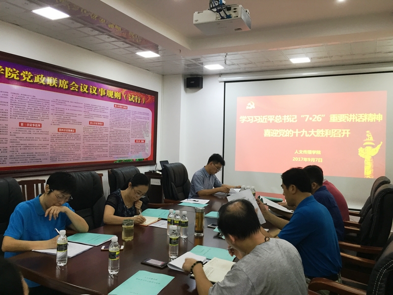 委员会办公室关于深入学习宣传贯彻习近平总书记“7·26”重要讲话精神的通知要求,9月7日下午,人文传播学院理论学习中心组在社科楼B615会议室,召开学习习近平总书记“7·26”重要讲话精神,喜迎党的十九大胜利召开专题会议。学院党委书记华世佳主持会议,院长刘复生、院党委副书记孙晓媛、副院长石晓岩、张硕果等理论学习中心组成员参加会议。