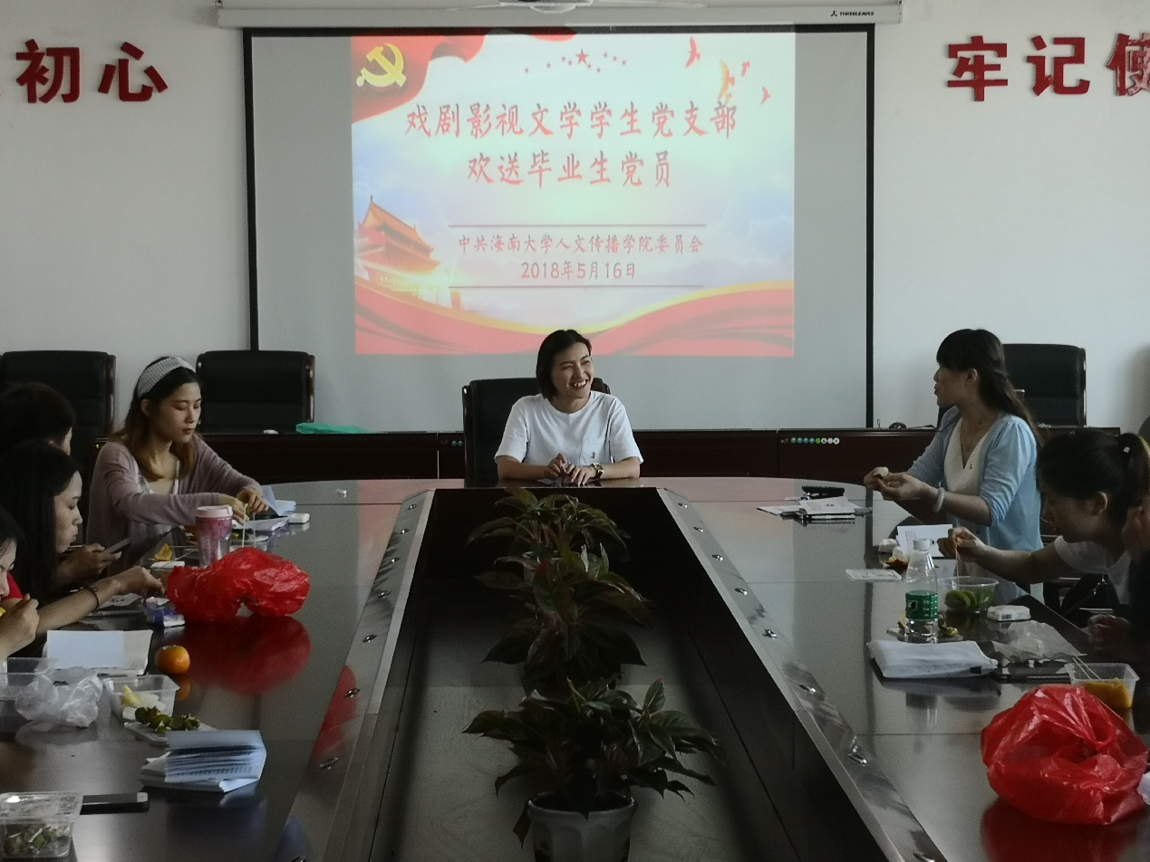 会议第三项内容是是戏剧影视文学学生党支部欢送毕业生党员,欢送会气氛轻松和谐,吃着水果的同时倾听了郭景霞同志代表毕业生党员的发言。