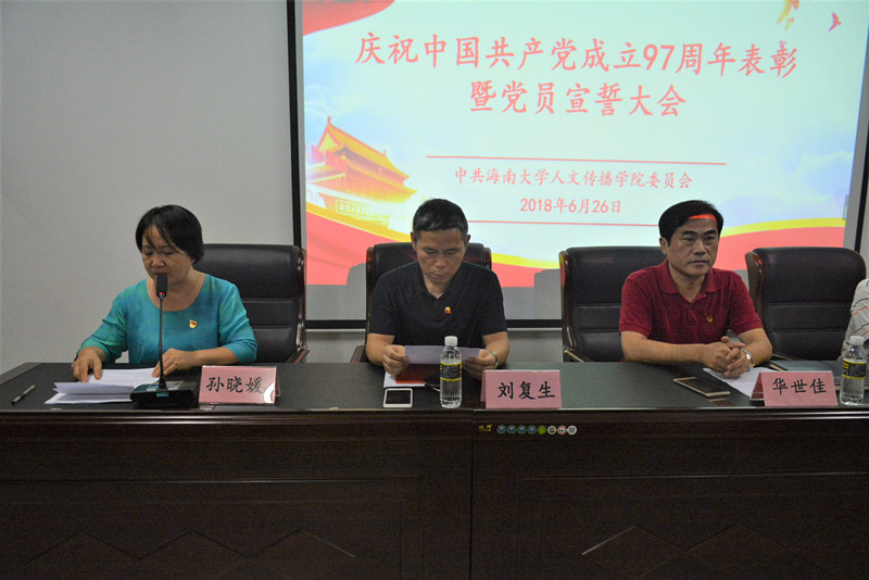 为铭记党的光辉历史和不朽功绩,不忘初心、牢记使命,充分发挥先进典型的示范作用,凝心聚力共谋学院发展,6月26日下午,人文传播学院庆祝中国共产党成立97周年表彰暨党员宣誓大会在社科楼七楼会议室(党员之家)隆重举行。学院党委书记华世佳、院长刘复生、副院长李彩霞以及全院师生党员参加了会议。学校特邀党建组织员林廷玖应邀出席会议,会议由学院党委副书记孙晓媛主持。
