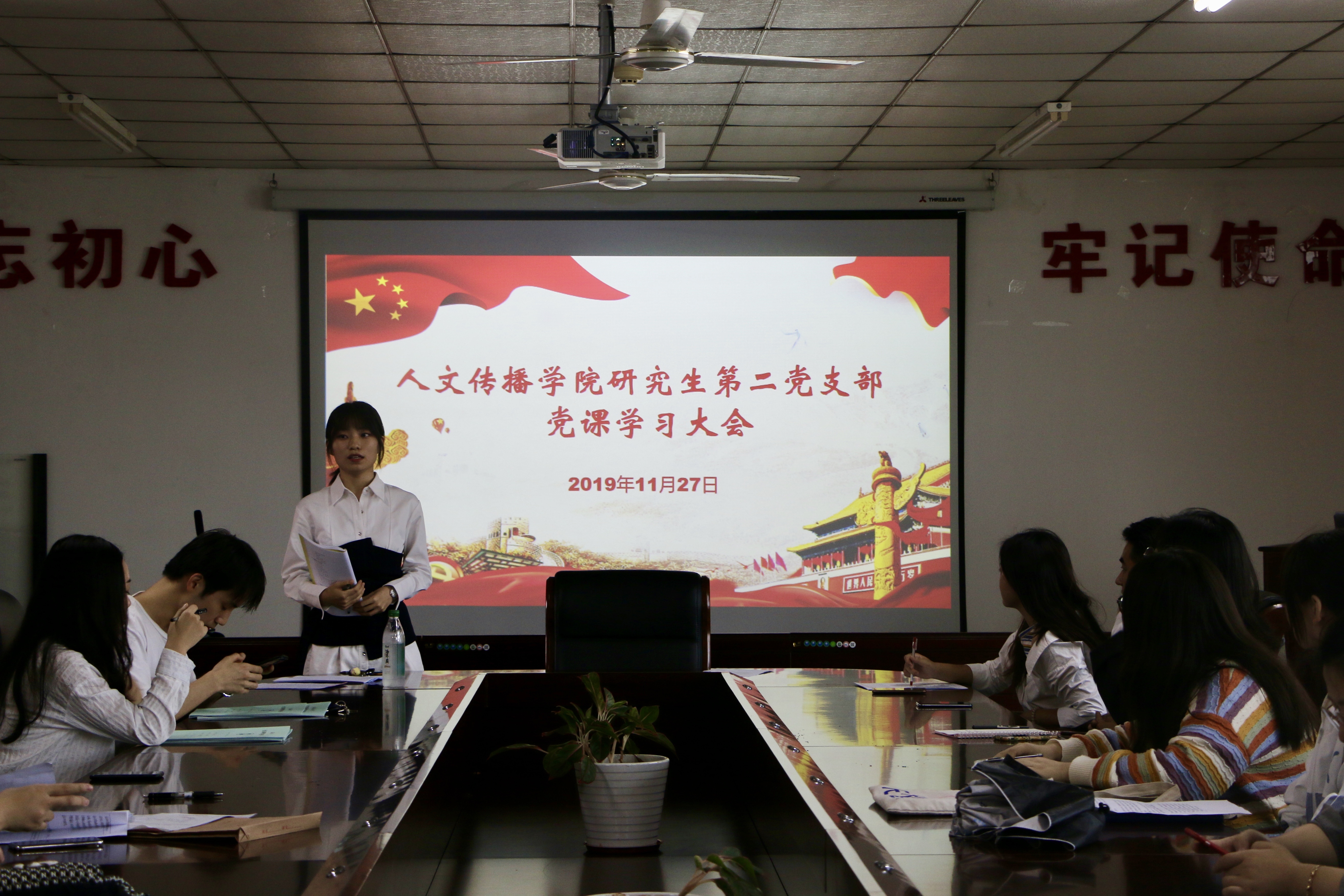 根据《人文传播学院“不忘初心、牢记使命”主题教育实施方案》讲好专题党课精神,为进一步抓好支部组织建设,严格规范党的组织生活,11月27日下午,研究生第二党支部于社科楼B719组织召开党课学习会议。支部所有正式党员、预备党员及6名发展对象参加了会议。
