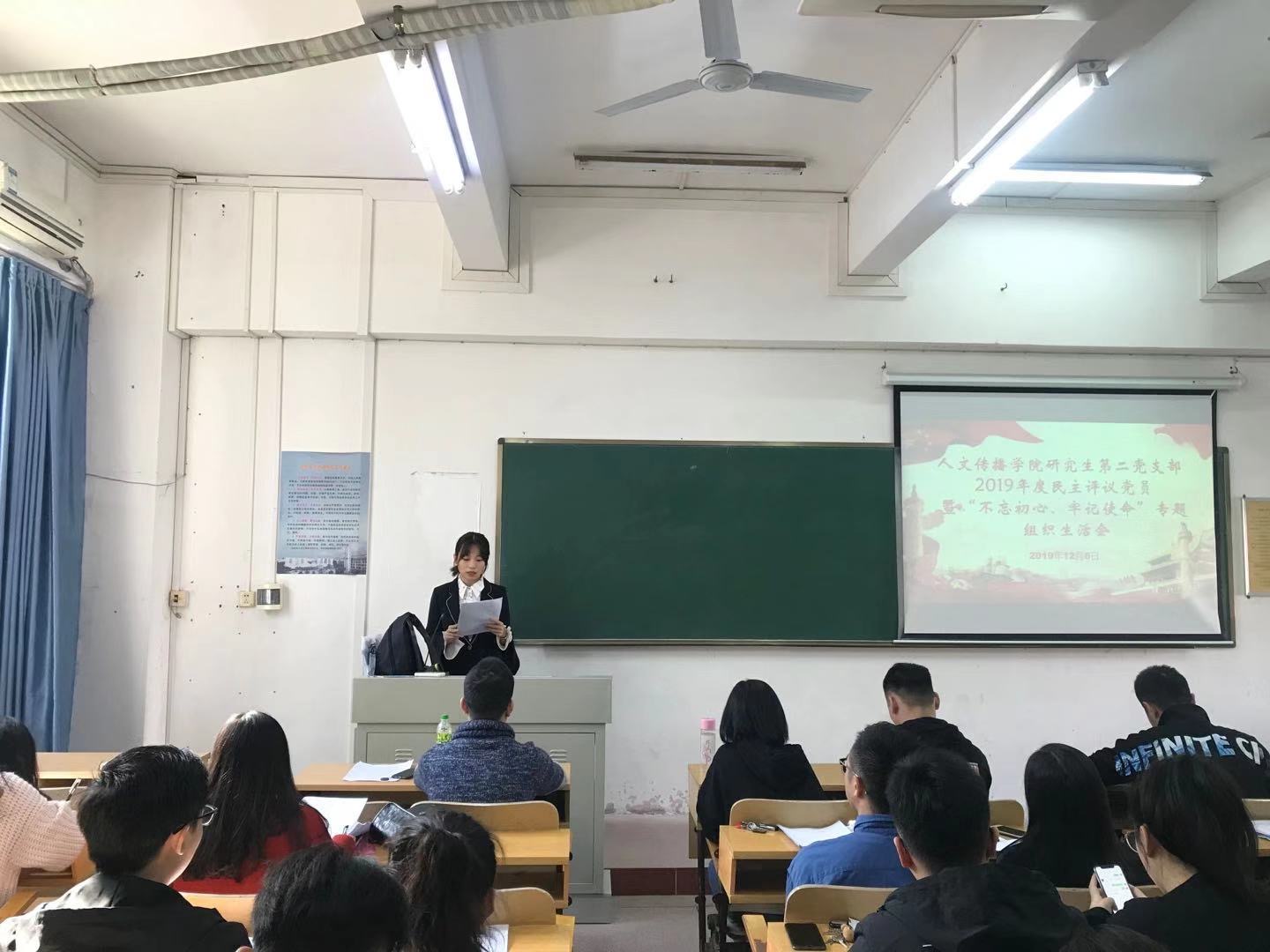 2019年12月6日下午3点,人文传播学院研究生第二党支部在2教206召开组织生活会和民主评议党员大会。会议由党支部书记宋鸽主持,人文传播学院研究生第一党支部书记公衍峰出席会议,研究生第二党支部全体党员、预备党员以及部分积极分子参加会议。