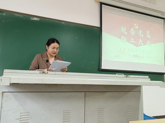 会议第一部分,由李文迪、李江萍、陈瑞林、关若瑶四名预备党员依次上台提出自己的入党转正申请,入党介绍人对预备党员一年的考察发表看法,支委会向支部大会介绍培养和听取意见等情况,党员逐一进行讨论和表决,最后四名预备党员均全票通过,顺利转正。之后,支部书记做了总结。支部书记李洁勉励预备党员转正后,更要加强自我监督,努力提升自己。在日常学习、生活中要起到先锋模范作用,处理好与群众的关系。并分享了“时代楷模 ”张桂梅的事迹,鼓励支部党员向其学习,不惧困难,努力奋斗,实现个人价值。