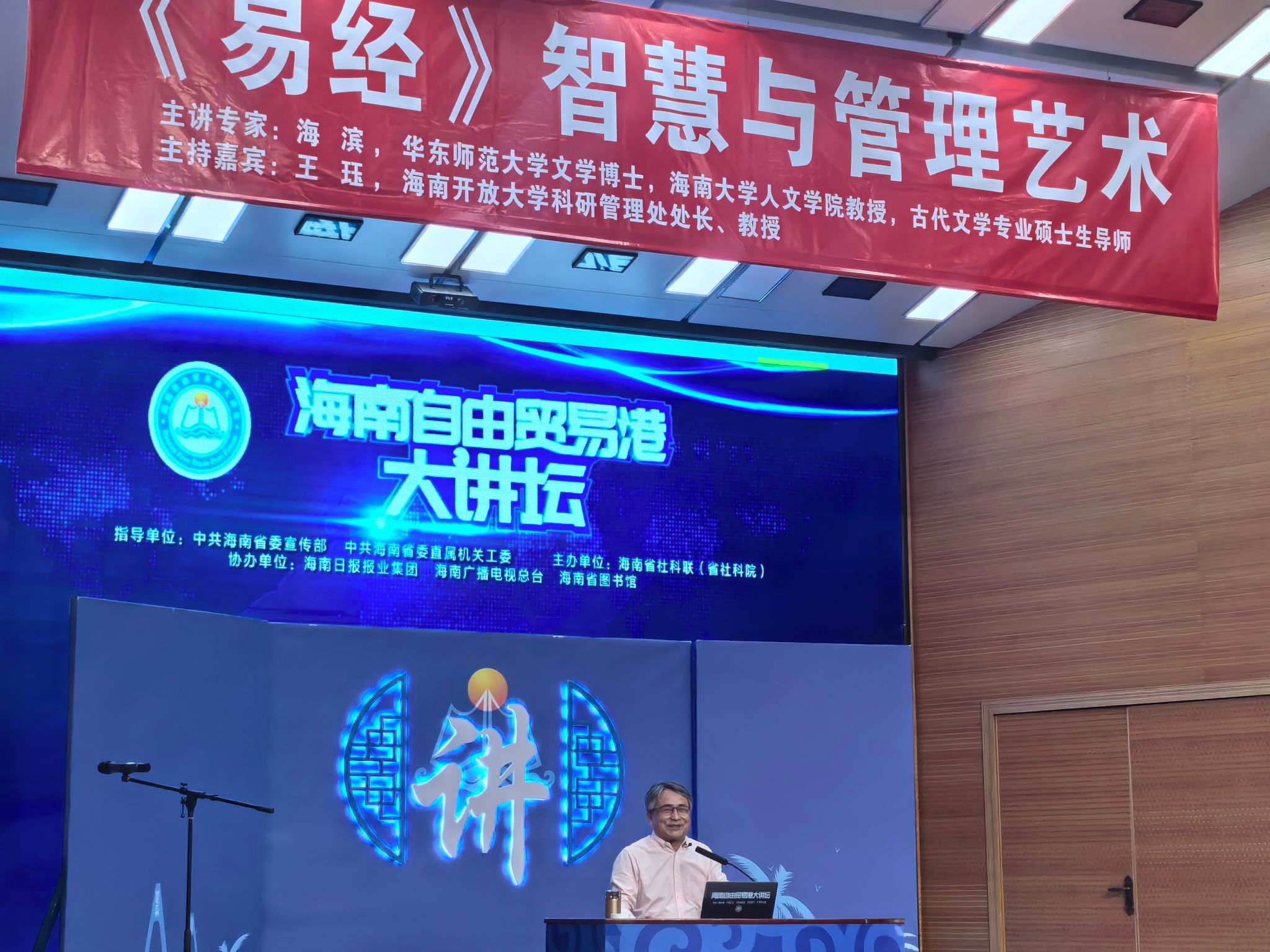“湖畔讲坛”开讲“故宫六百年”的工作细节和损益得失为例,讲述《易经》文化无处不在的道理。海老师解析了《周易·序卦传》,他认为六十四卦就是人人难以逃脱的自然、社会、人生的六十四种状态,卦序则体现着辩证、有序、提升的积极导向;海老师又以乾坤两卦为例,提醒大家明确自己的定位、身份、诉求,既要为之努力,也要学会换位思考等。海老师认为,上至治国理政,下至修身齐家,《易经》智慧可以帮助我们有效地自管管人管天下,自理理事理内心,这对于我们建设海南自由贸易港具有重要意义。