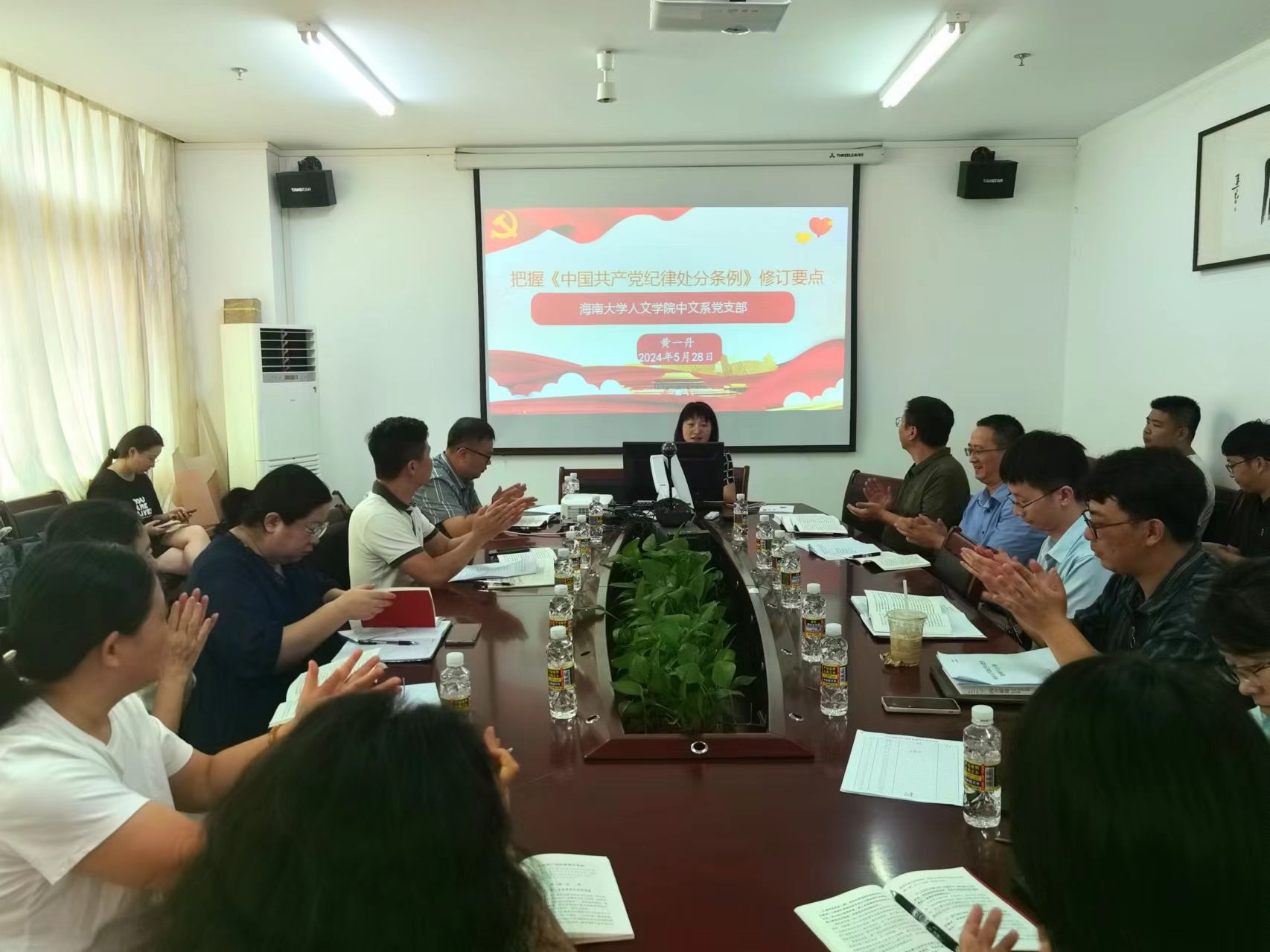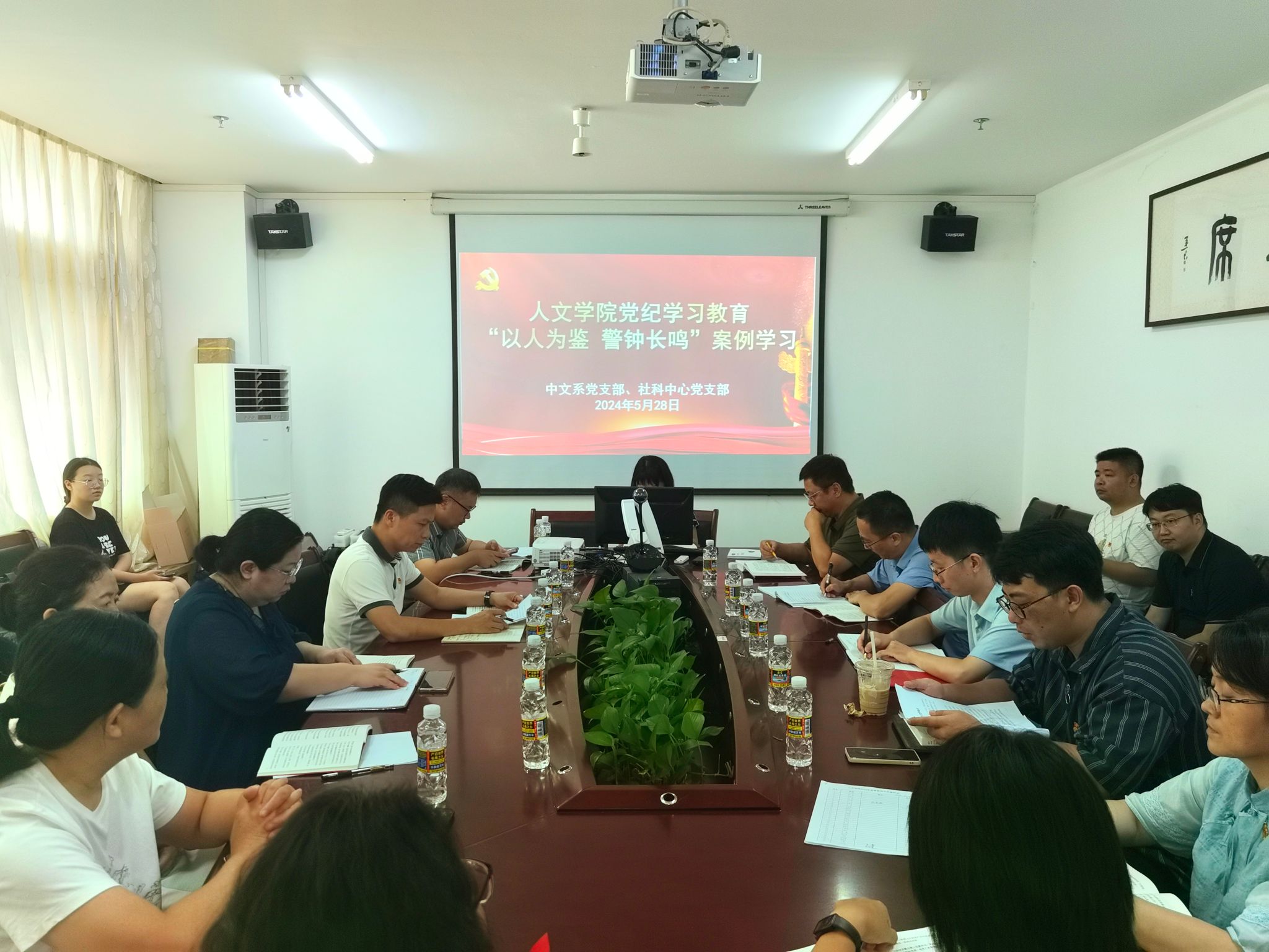 中文系党支部、社科中心党支部在社科楼会议室C312召开支部党员大会,联合开展党纪学习教育,通过支部书记上党课、逐章逐条学习、案例警示教育、会上交流研讨等方式推动党员党纪学习教育。
