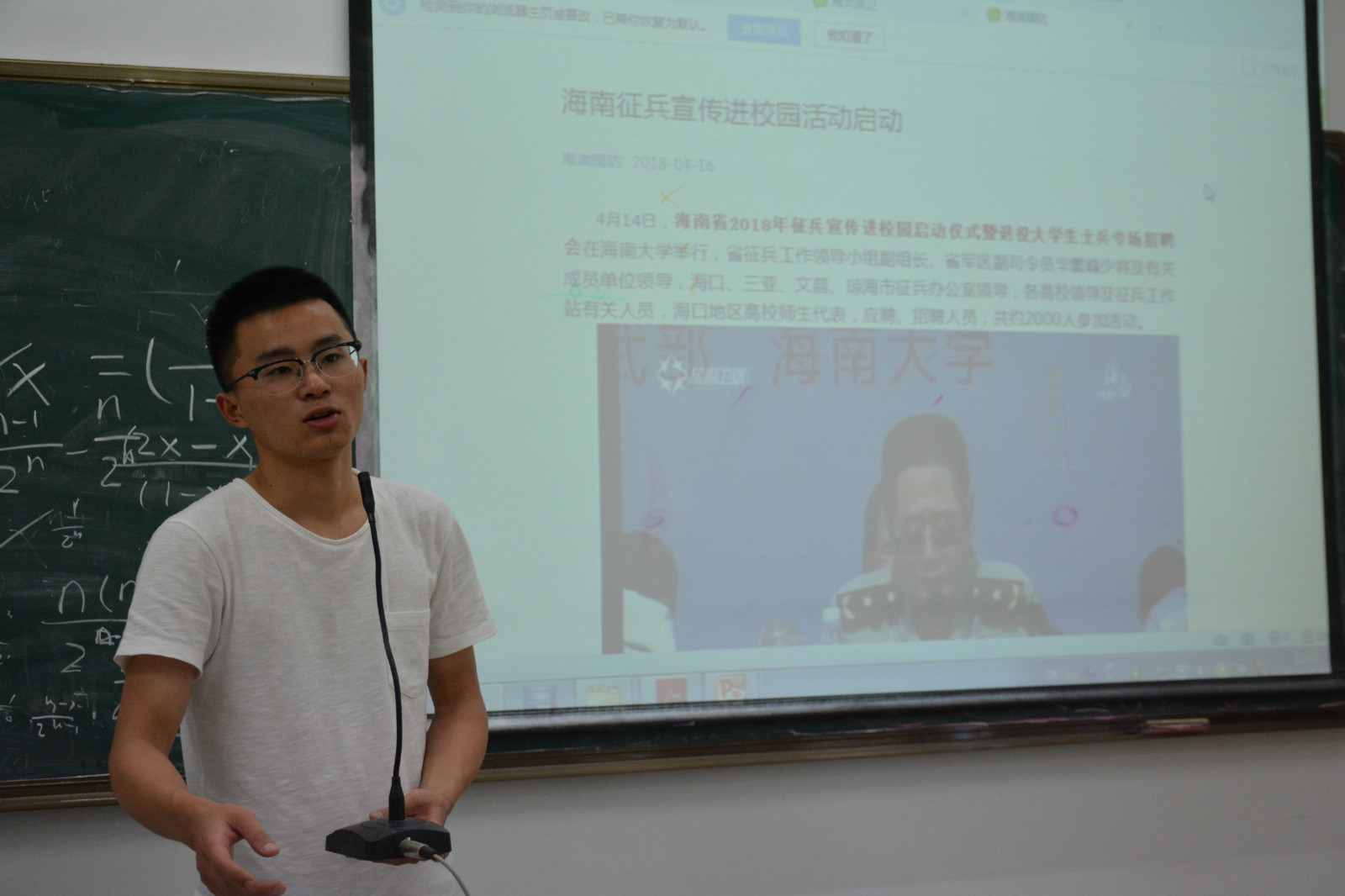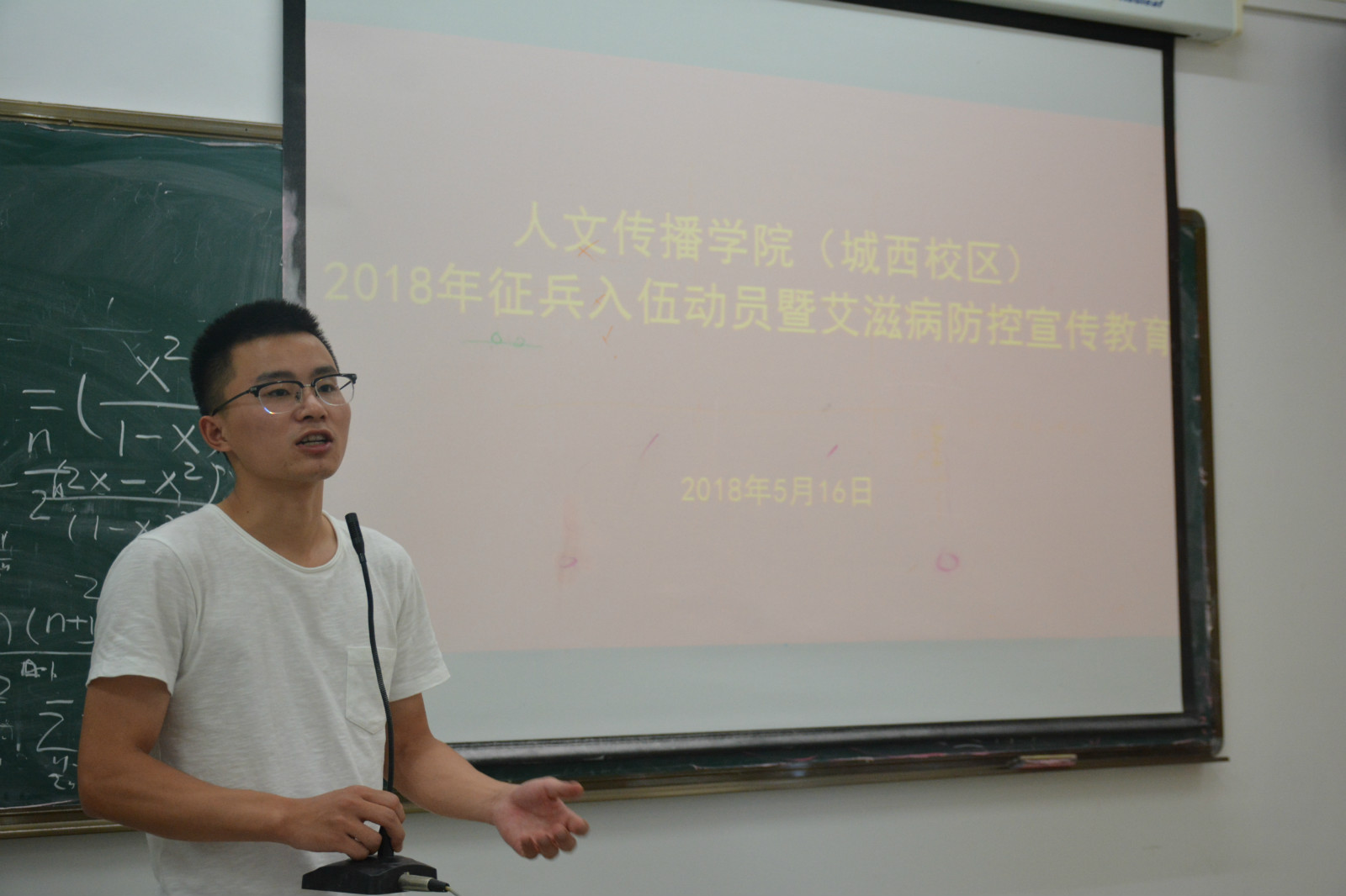 5月16日上午,人文传播学院(城西校区)开展2018年征兵入伍动员暨艾滋病防控宣传教育,会议在教学楼9A01举行。人文传播学院2017级辅导员李润东老师、17级全体班委及年级全体男生参加会议。