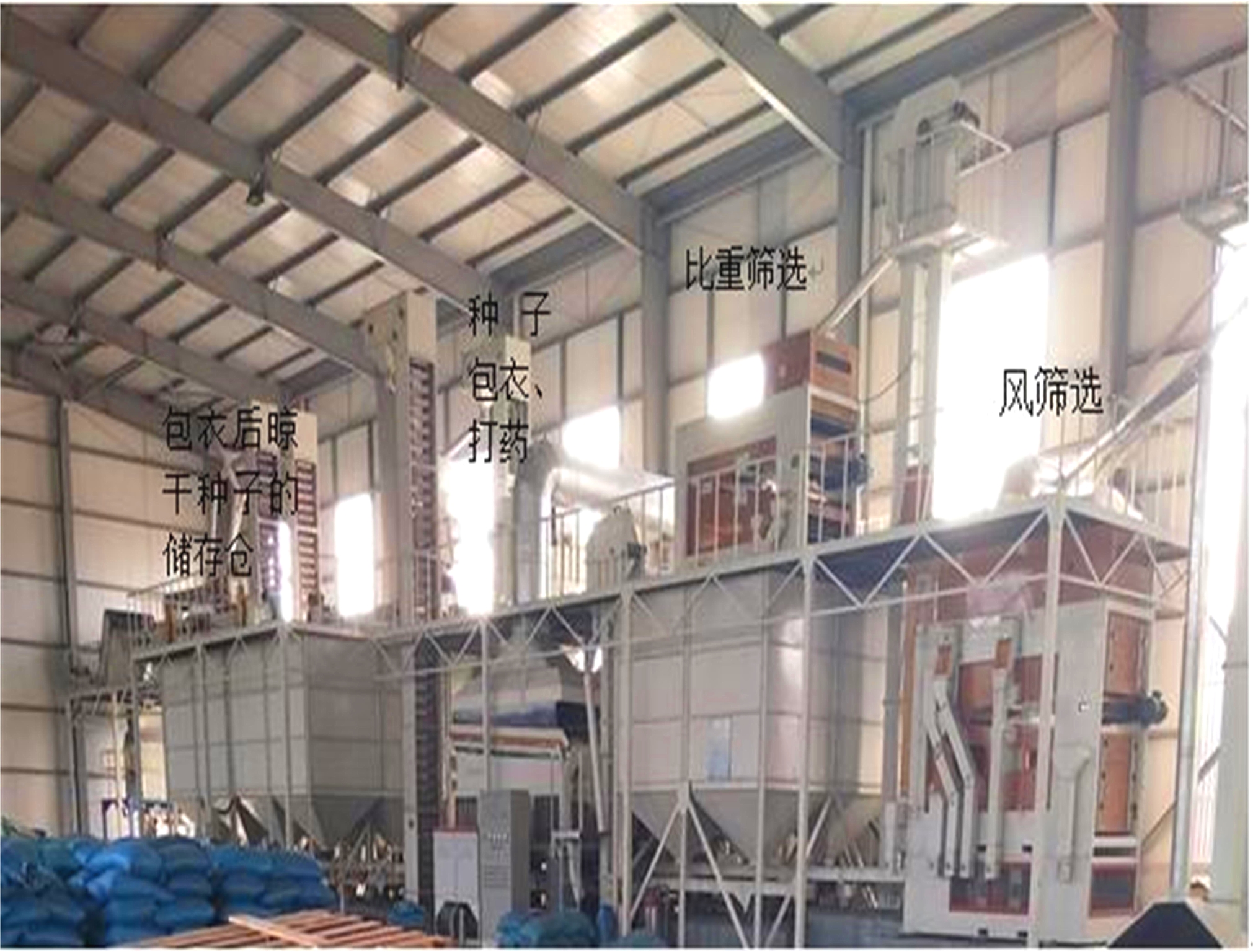 玉米选种流程。通过热心的工作人员了解到,玉米的选种流程需要先后经过风筛选、比重筛选、种子包衣和打药、晾干储存四个流水线阶段。其具体流程内容为通过风度控制玉米粒大小,将破瓣的粒子与好的粒子进行分离,然后通过传送带将好的粒子传送到比重选机器进行比重筛选,其根据玉米棒上玉米颗粒分布的特点,将玉米棒上部的小粒、过大和破损的颗粒筛选出去,成为商品粮或饲料进行市场销售。剩下均匀的颗粒进入种子包衣机,给种子涂颜色并附带打除虫剂,以防止害虫等对种子的损害。