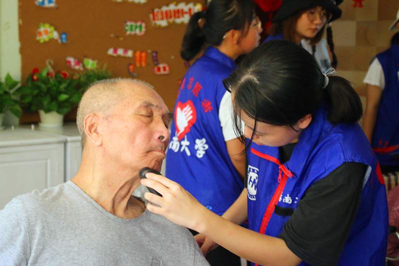 活动开始前,带队人员对志愿者们进行了简短的培训,向他们介绍了公寓中老人们的基本情况与注意事项,在志愿者们了解情况后,活动正式开始。志愿者们有序地分为三组,在专业护理人员的指导下为不同楼层的老人进行简单的服务工作,如,修剪指甲、修理胡须、喂水喂饭等。志愿者们认真细致的工作受到了护理人员的一致赞赏,老人们对志愿者们的表现也十分满意。