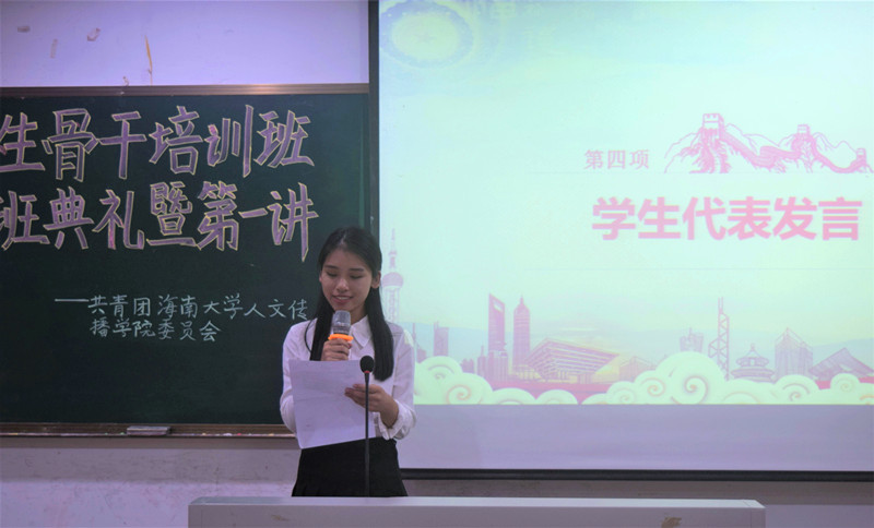 开班典礼在庄严的国歌声中拉开帷幕,熊文军老师在开班典礼上致辞,他以本期团校培训主题——“青春作伴好学习,团团和你在一起”——鼓励学员铭记学生干部们为大家服务的初心,并不断加强学习,实行自我完善,努力成为一个更优秀的人。随后团委组织部干事宋诗怡为学员宣读了团校章程和学员最终成绩评定方法。2018级学生张博蔚代表学院学员发言,表示作为一名学生干部应该兼顾好自己的学习和工作,努力散发自己的光和热,更好地服务同学。开班典礼在全体学员合唱中国共产主义青年团团歌《光荣啊,中国共青团》中圆满落幕。