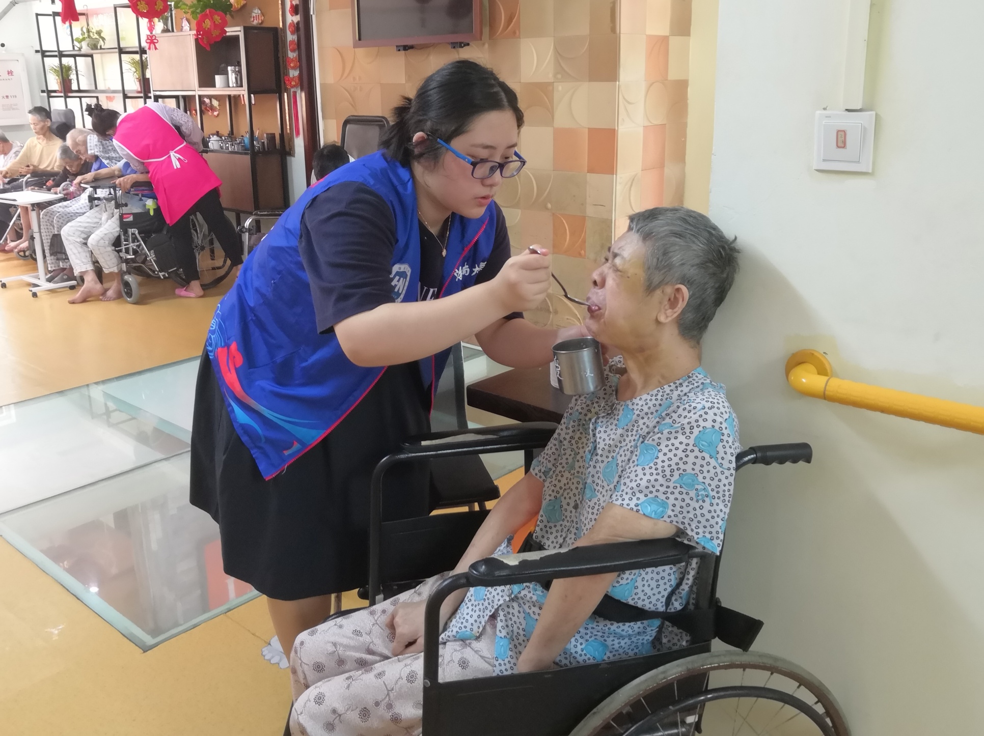 志愿者为老人喂饭