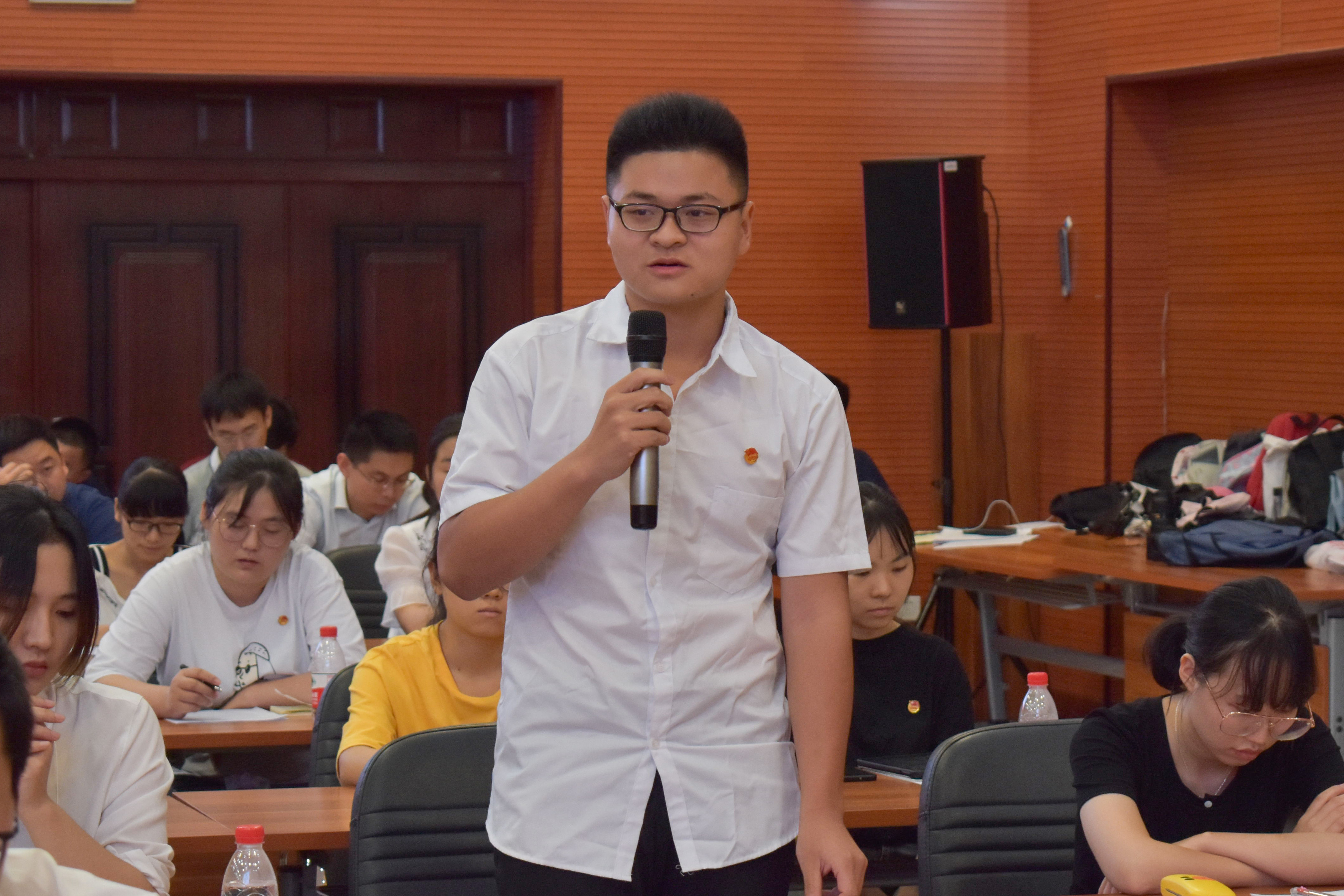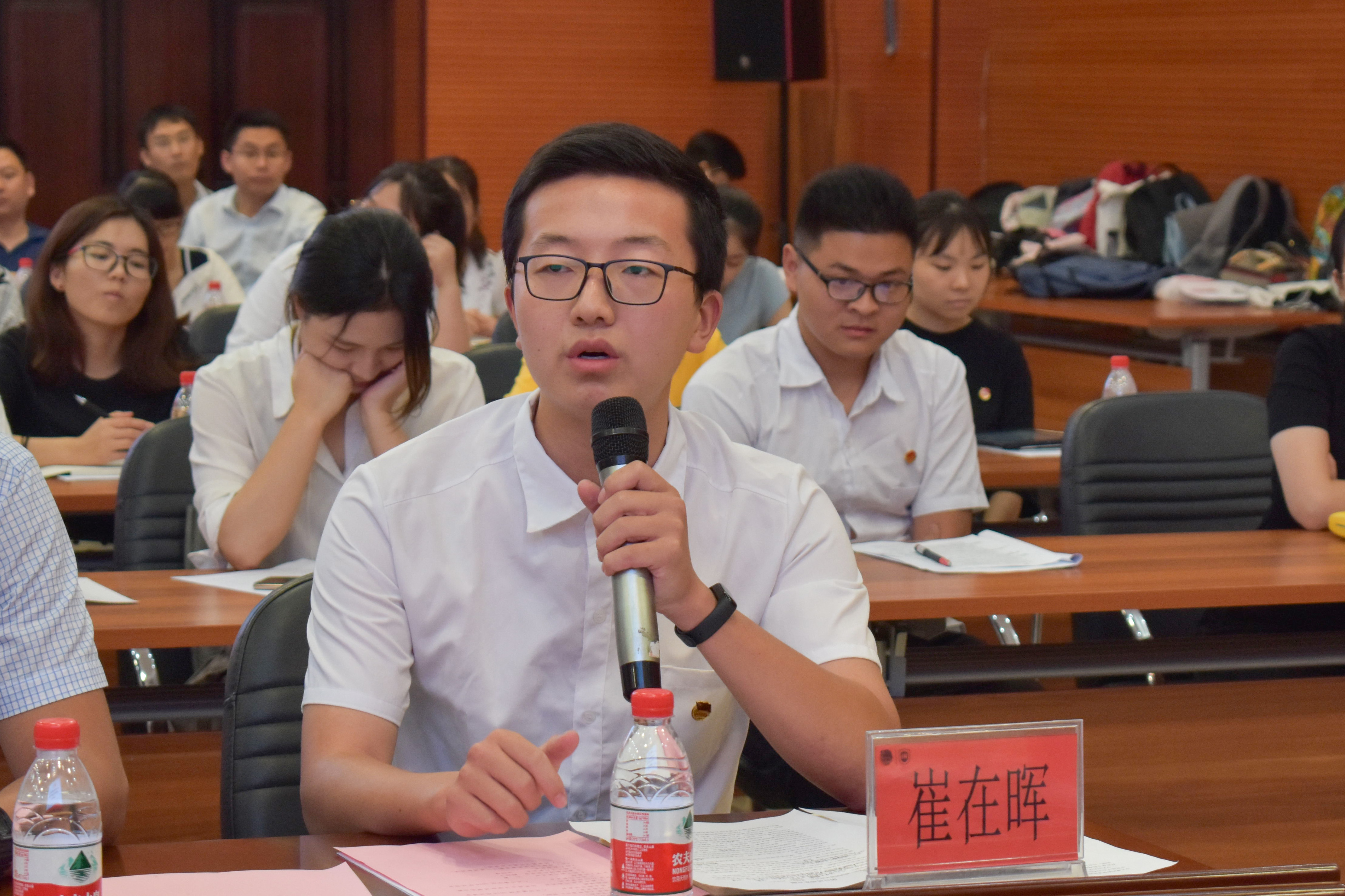 2016级汉语言文学1班团支部同学的发言,并不时围绕班团一体化建设、团支部活力提升、志愿服务活动等支部工作与发言的同学进行互动交流。盖文启在讲话中向在座的青年师生代表表达了节日的祝福和亲切问候,他结合习近平总书记在纪念五四运动100周年大会上的重要讲话精神分享自己的学习体会并给在座的团员青年们提出五点要求:深入学习贯彻习近平总书记在纪念五四运动100周年大会上的重要讲话精神,切实提高思想认识;坚定理想信念,大力弘扬爱国主义;善于学习思考,练就过硬本领;努力崇德向善,自觉践行社会主义核心价值观;勇于创新创造,勇于担当,积极投身自贸区(港)建设。