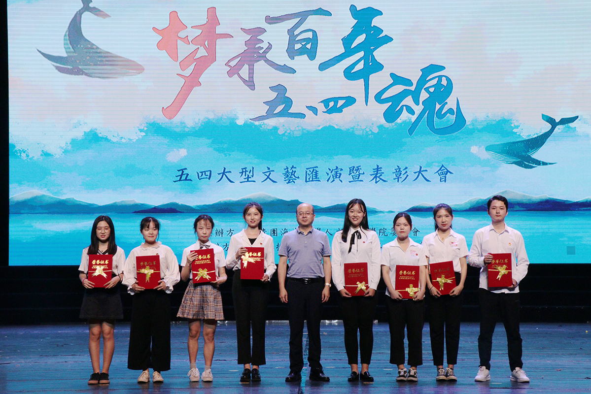 五四红旗团支部”奖项的领奖代表颁发荣誉证书并合影留念。