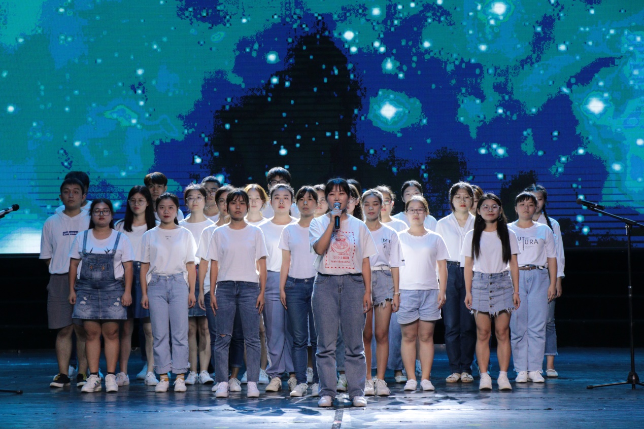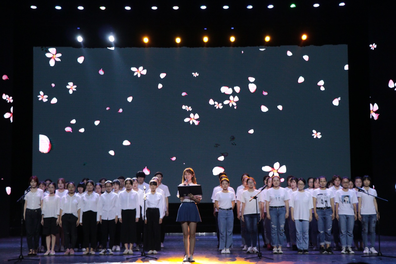 第二篇章“百载悠悠?往昔峥嵘岁月稠”中,17级新闻传播学类的同学们带来的朗诵和合唱《请回答一九,一九》,唱出了同学们青春向上的豪迈之情。17级中国语言文学类的同学们带来的合唱《歌咏青春,时代有声》,散发出昂扬向上的青春活力,年轻的心跳韵动出时代的脉搏。