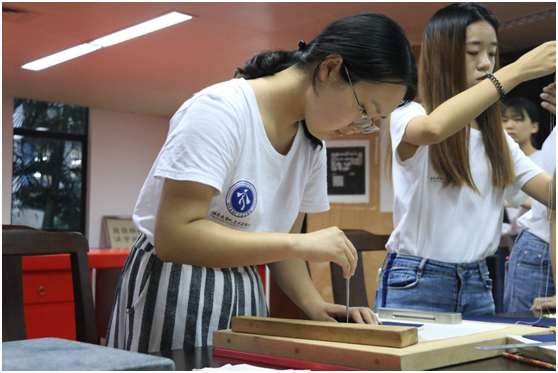 8月21日,在海南省图书馆黄文锋老师的专业指导教学下,实践队员分为两组,分别进行了雕版印刷和线装书的参观与体验。