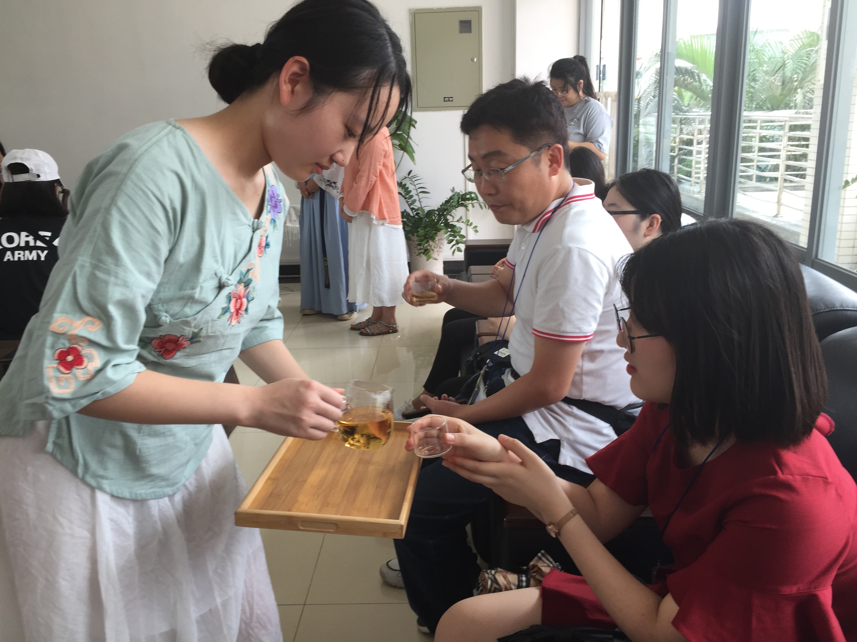韩国东海市青少年代表团的老师和同学们在主持人引导下就坐,交流活动在悠悠古筝声中拉开序幕。本次交流活动以中华茶文化为主题展开。主持人为到访的韩国师生详细介绍了国学社的概况和日常活动,随后进行了茶艺展示,并在表演过程中系统地介绍了茶匙、茶壶、茶杯、茶洗等茶艺工具,同时演示了这些工具的具体使用方法。之后的品茶环节中,主持人为在座的中外师生介绍了茶道礼仪,如“三龙护鼎”等。这些演示不仅向韩国师生科普了中华茶文化,同时也展示了中华茶文化的精髓和底蕴。