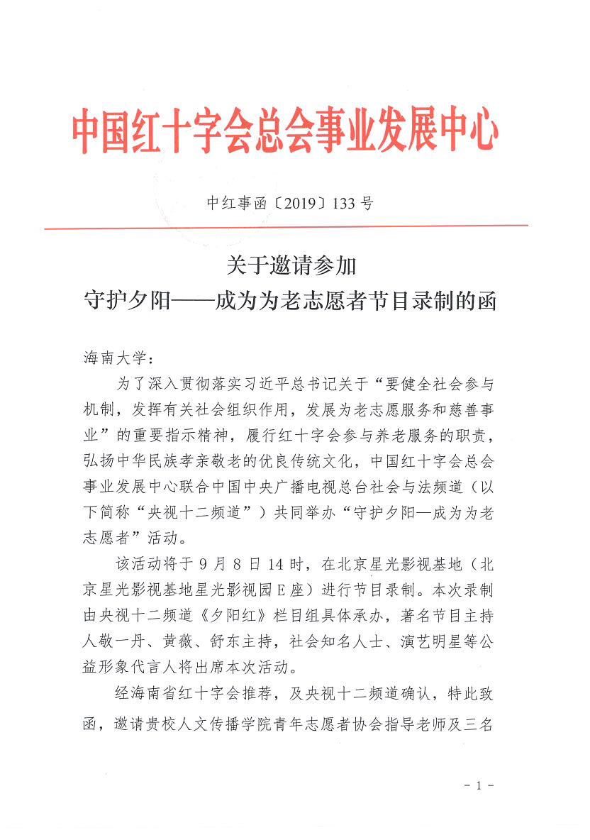 2019年9月8日,学院党委副书记孙晓媛与青年志愿者协会陈佳凤、黄媛媛、黄艺玲三名学生代表受邀赴京参加中国红十字总会事业发展中心联合中国中央广播电视总台社会与法频道共同策划的“守护夕阳——成为为老志愿者”节目录制。