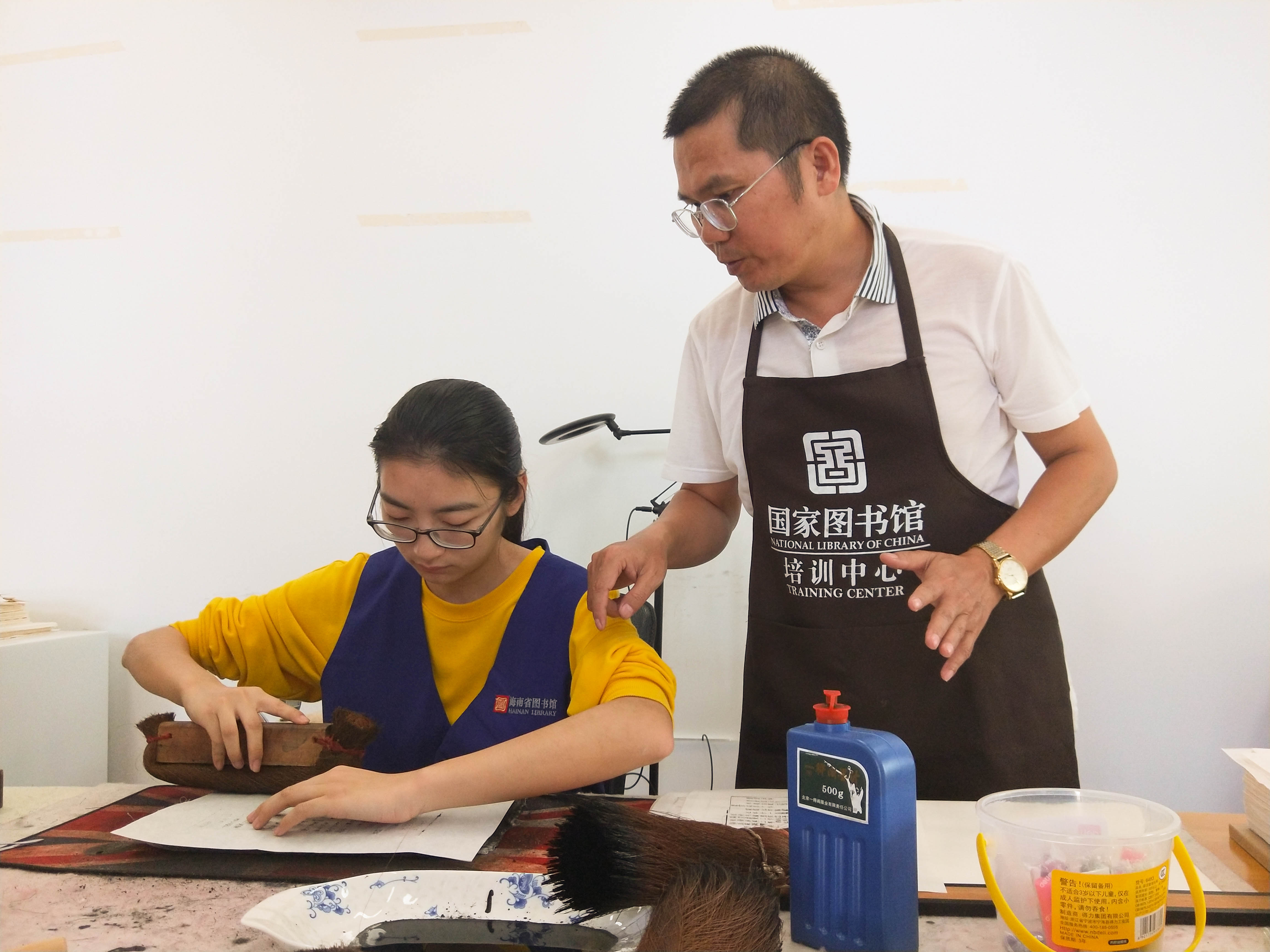 志愿者在省古籍保护中心老师的安排下分成三组,分别负责雕版印刷、分拣成品与书页排序。下午三时许,位于图书馆三楼的拓印室传来抑扬顿挫的刷子轻扫声。古籍保护中心的老师不断提醒着志愿者,“这里墨压的不够实”、“这里刷子这样扫更合适”……志愿者认真倾听着老师的指导,一步一步调整着传拓手法,拓印出的字迹逐渐清晰,墨迹逐渐平整,得到了老师的肯定。学习雕版印刷的志愿者在古籍保护中心老师的指导下,已经可以完整、清晰地拓印出一张完整的古籍资料。拓印出的书页则被送往阅览室进行整理排序装订,相关志愿者们已经做好了分工,从挑选、分拣拓印成品,到按页码排序,整理成册,井然有序地开展着工作。