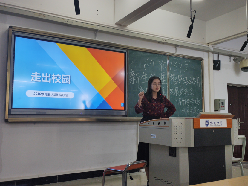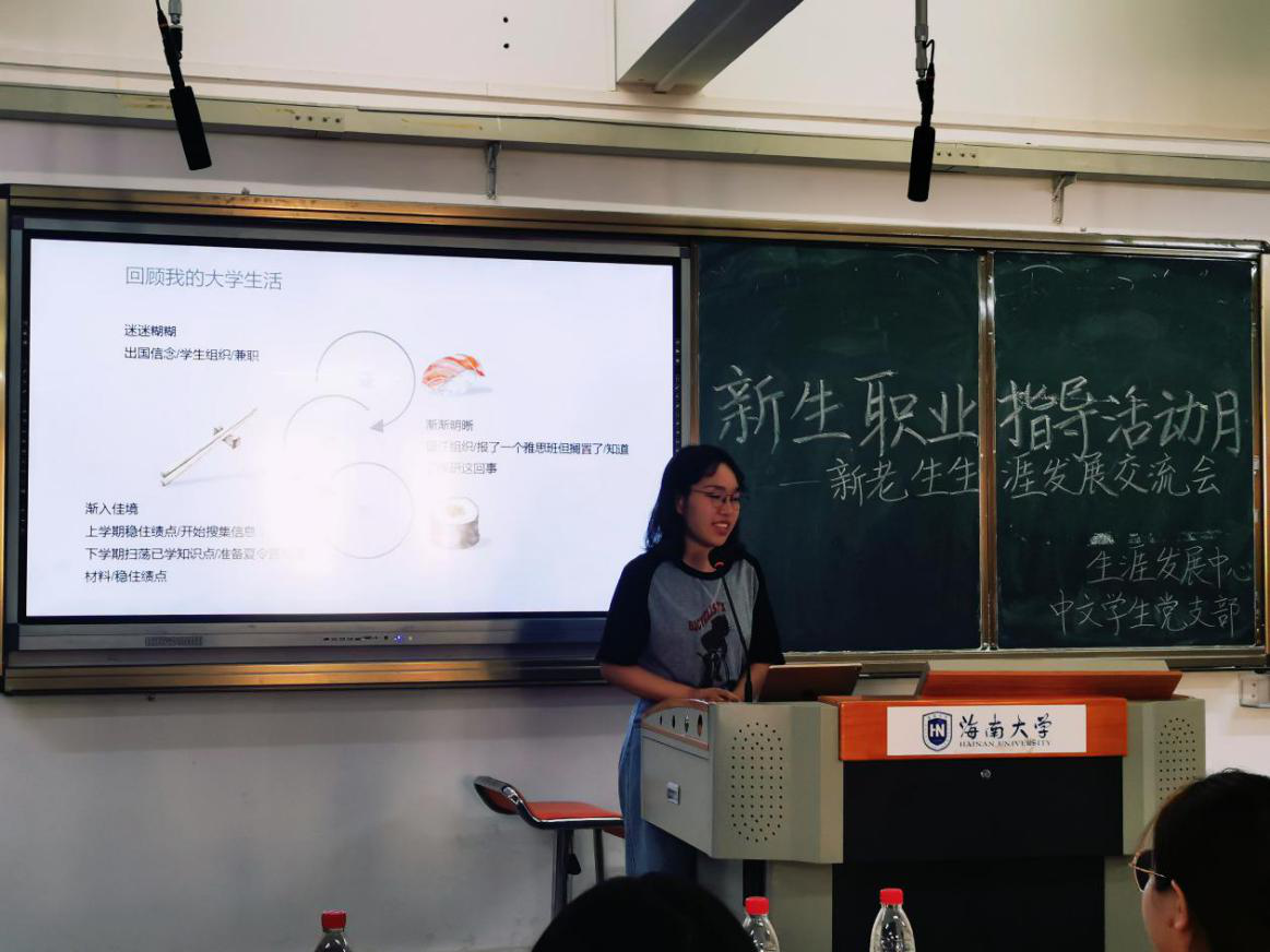 而骆心怡学姐则为我们讲述了她丰富的履职经历,她通过自己的努力获得了为期一年的台湾交换生资格并且在多家大型企业都进行过实习,同时她目前也在为出国留学做准备。而学姐更是提出了一些深刻的建议,像多进行阅读,多尝试,对自己保持信心这些,使同学们对未来有了更多的想法和期待。