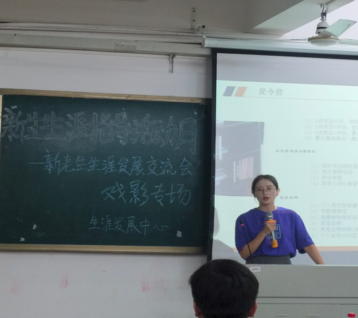 在新传专场进行的同时戏影专场的分享会也开始了,首先是程晓梅学姐上台作分享,晓梅学姐向同学们分享了她的学习经验,其中包括保研经历、要求、流程等等,学姐还和同学们交流了专业课和英语的学习方法,如何做好推免保研的准备工作等等。