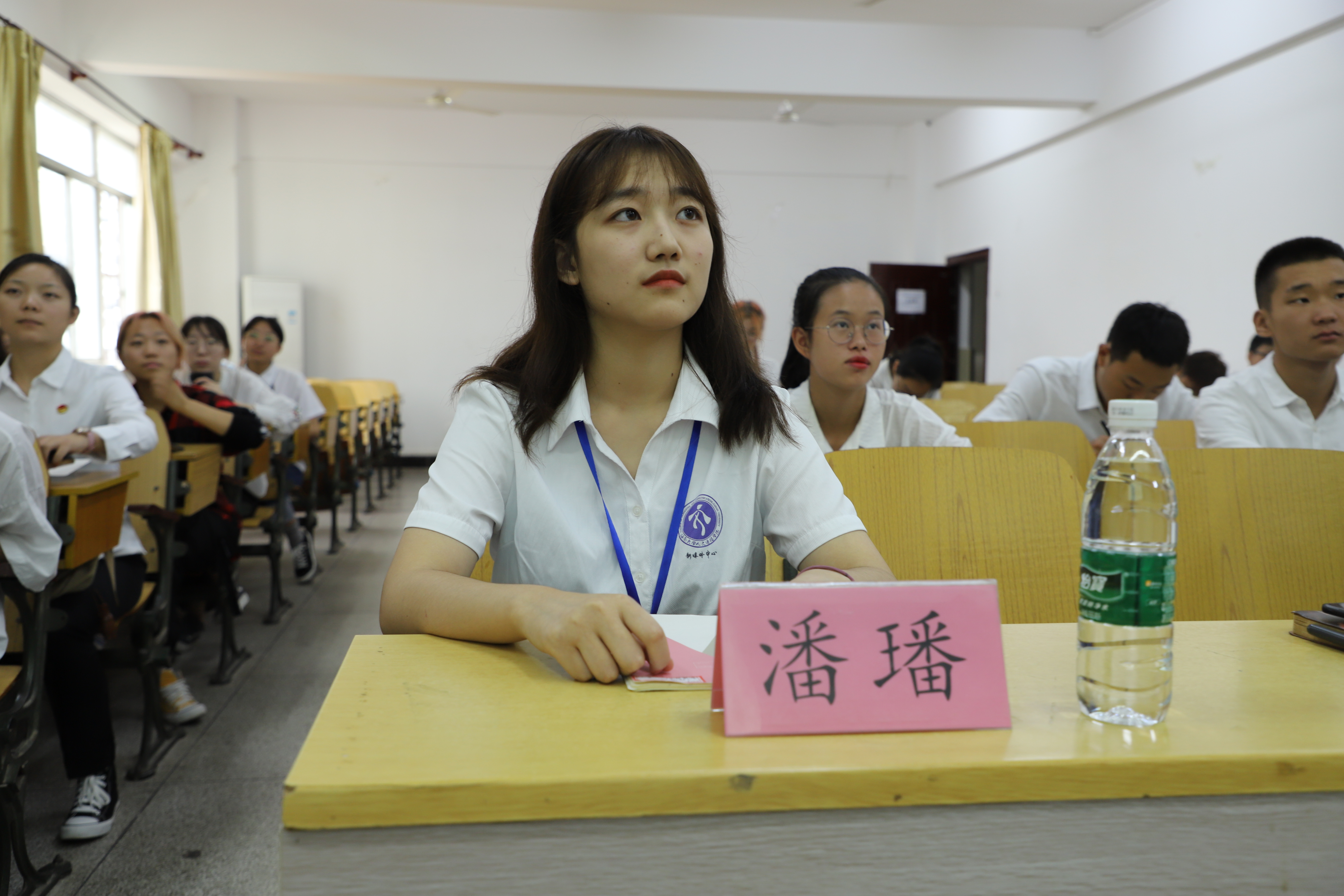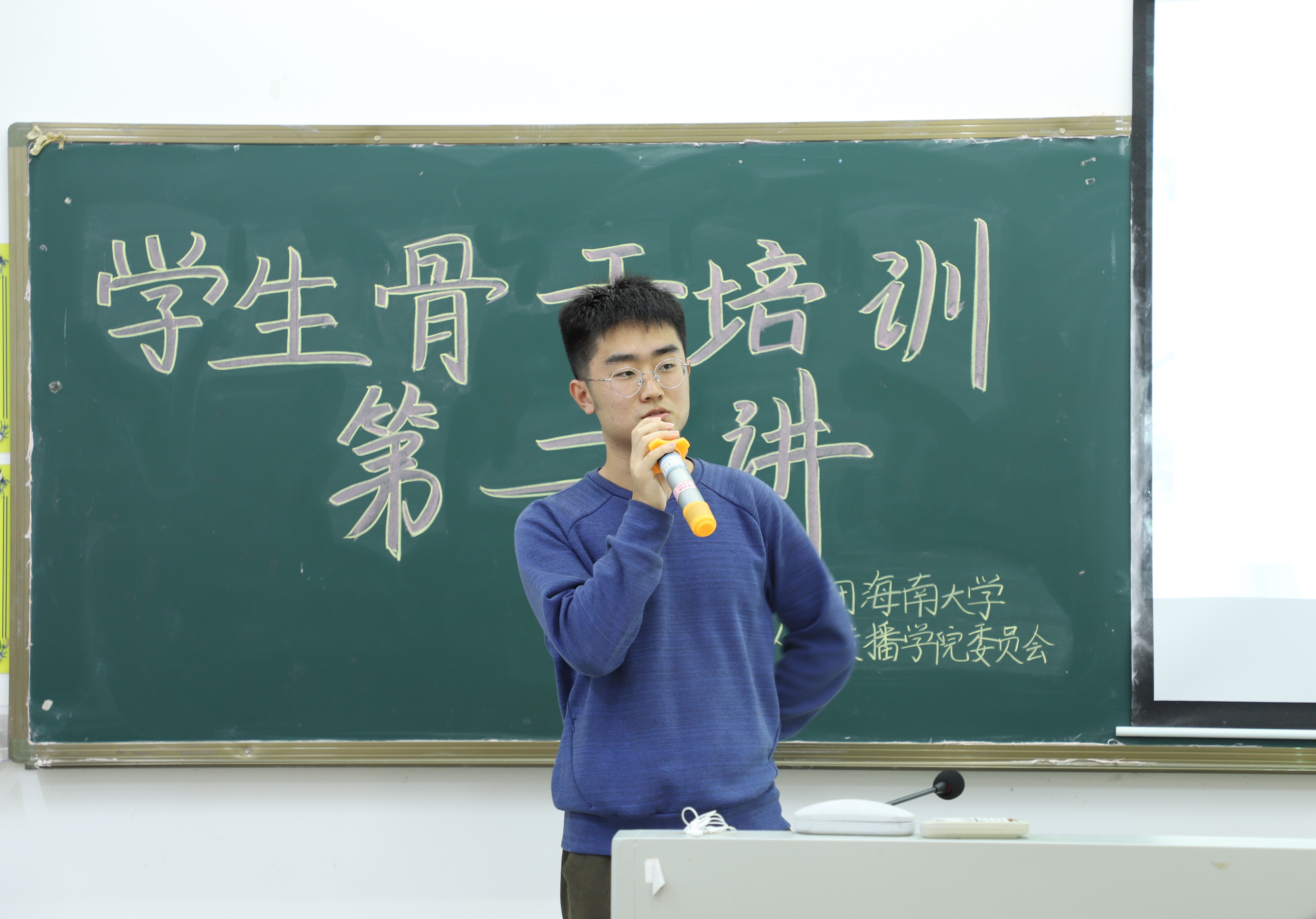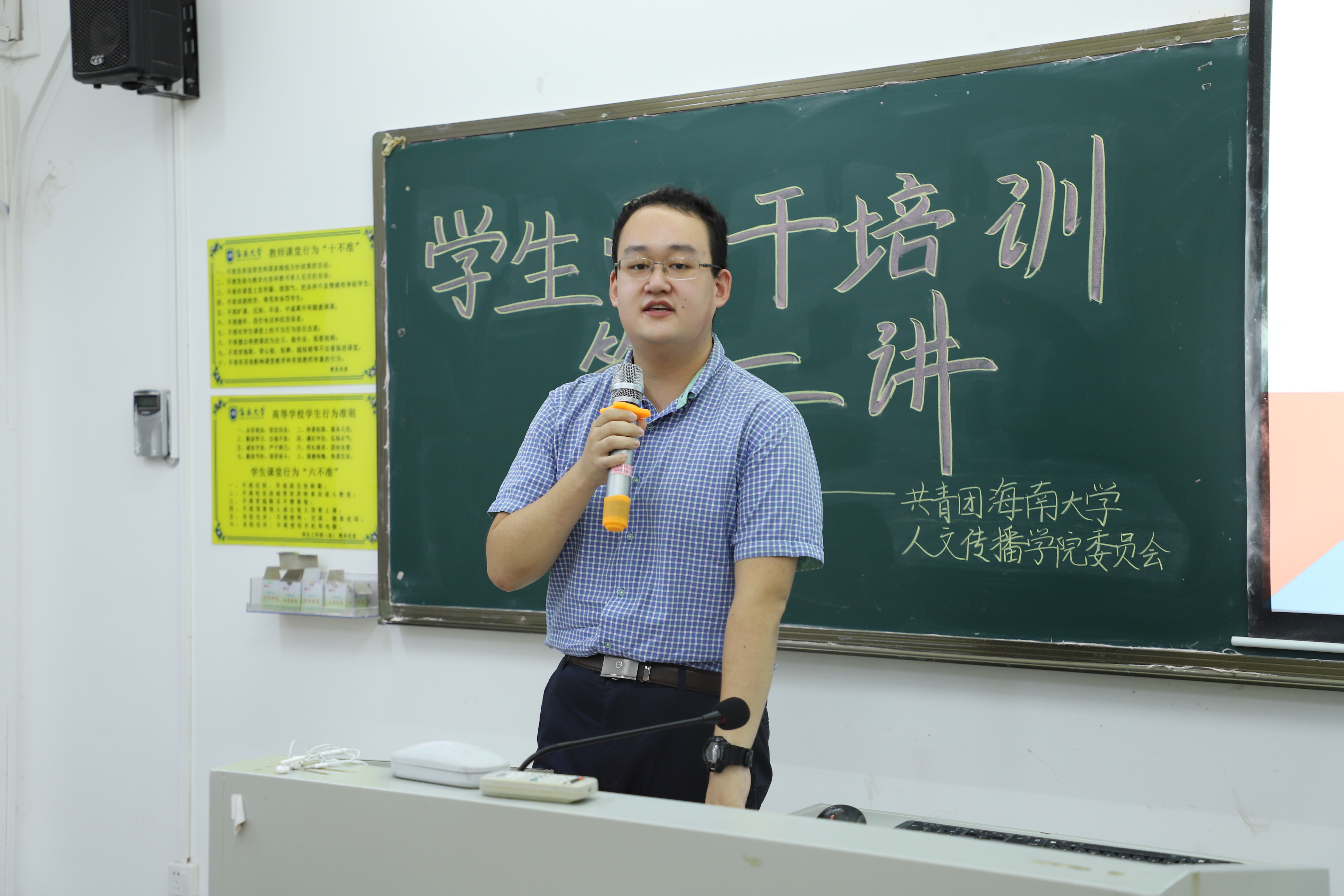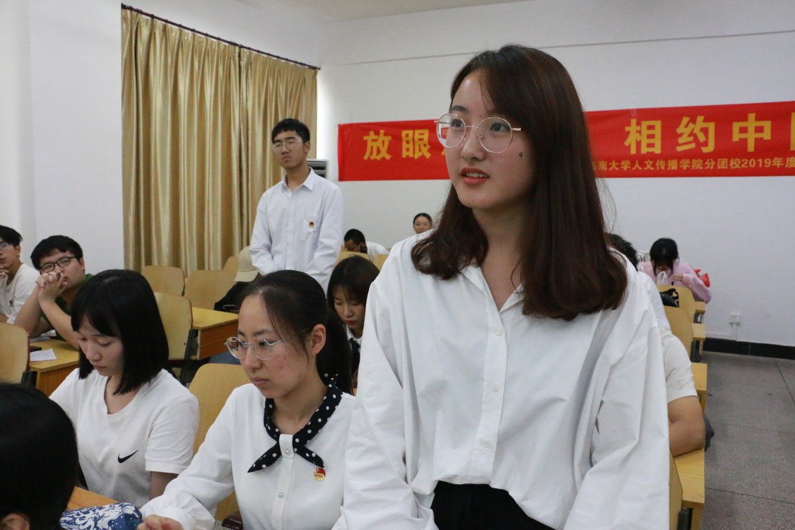 在学生组织会场中,2018-2019年度人文传播学院团委学生副书记秦天、2018-2019年度人文传播学院青年志愿者协会副会长郑富仁、现人文传播学院新媒体中心副主任潘璠依次进行工作经验分享。