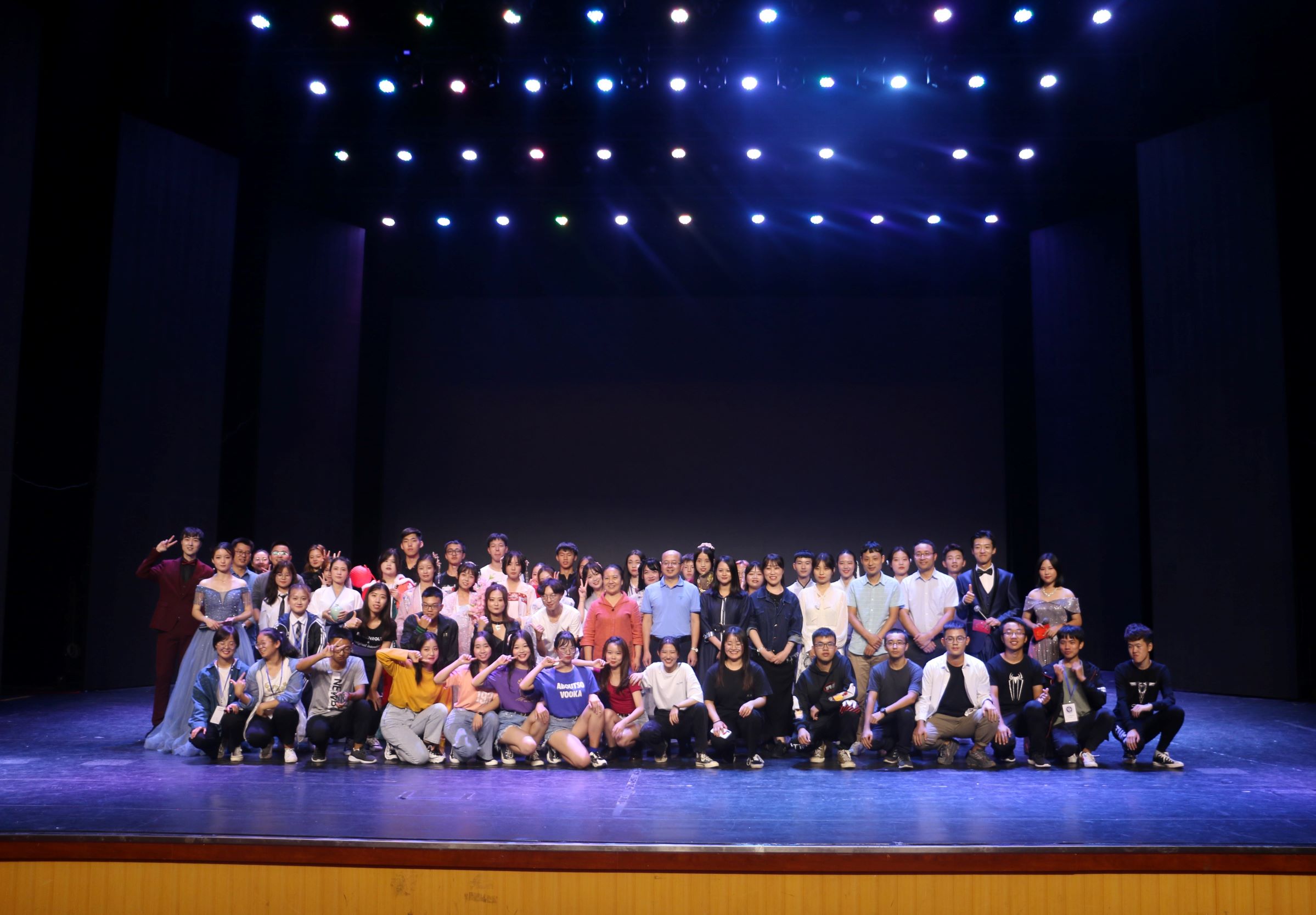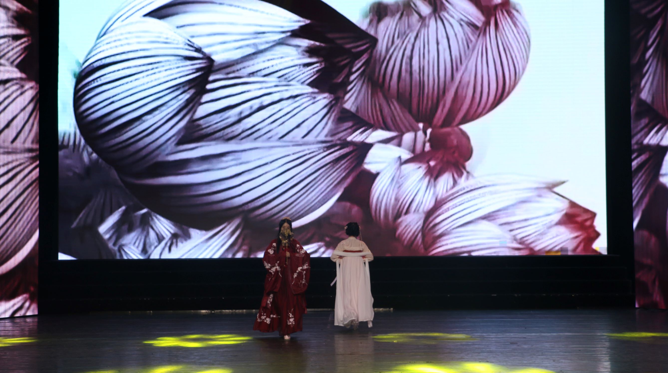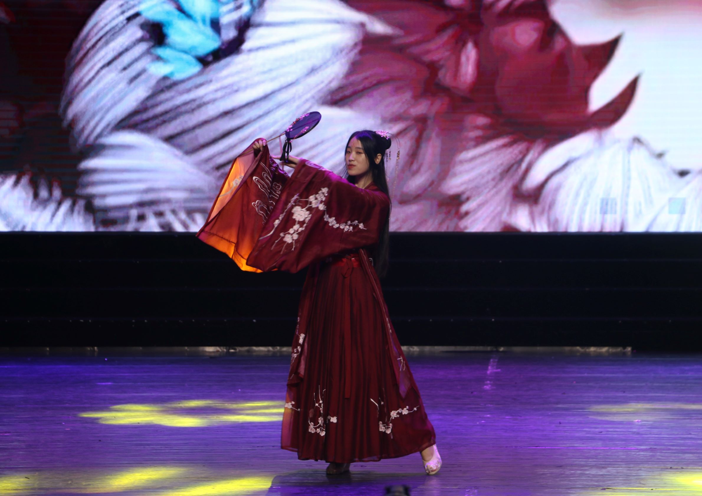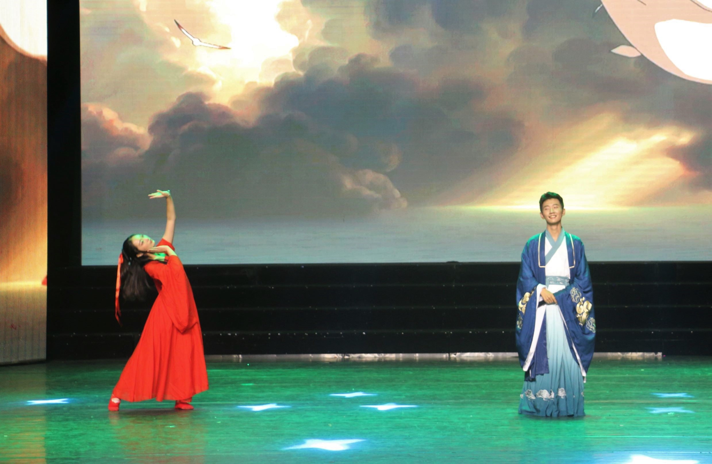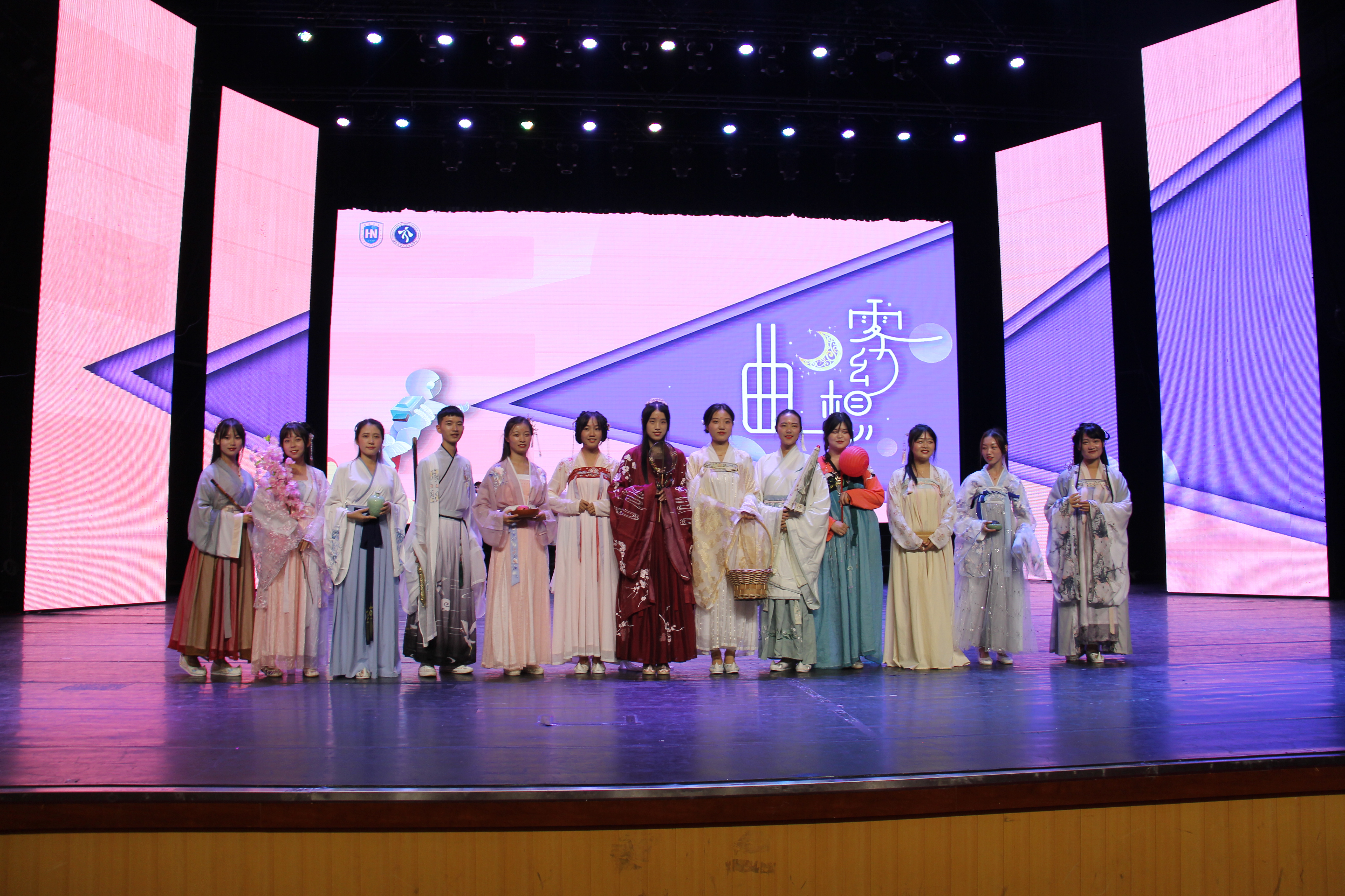 晚会过半,我们跟随着欢笑的步伐来到了第三篇章"人间惊鸿客"。山川变换不停,烟火昼夜不灭,人间惊鸿总不缺梦想信念。在此篇章中,王世震同学率先为我们演唱了《海阔天空》,用充满张力的歌声歌颂自由与梦想。歌声散去之后紧接着的是《描声》,刘鹏铧、卢邑华二位同学带来机械舞表演,用丰富的肢体语言带我们在声音中徜徉。篇章末尾,国学社上演《四时景》汉服走秀,演绎一年之中十二个月份的不同色彩,为我们带来了一场华服的视觉盛宴。随着三个篇章的表演结束,晚会也接近尾声。美丽的樱花草被谁拿在手里,一朵朵种下我们难忘的少年时光。优美浪漫的旋律伴随着美好的青春记忆,李斌、苏承玲、汪宏伟、符明超四位同学在熟悉的《樱花草》中宣告今夜落幕,演员们上台谢幕。