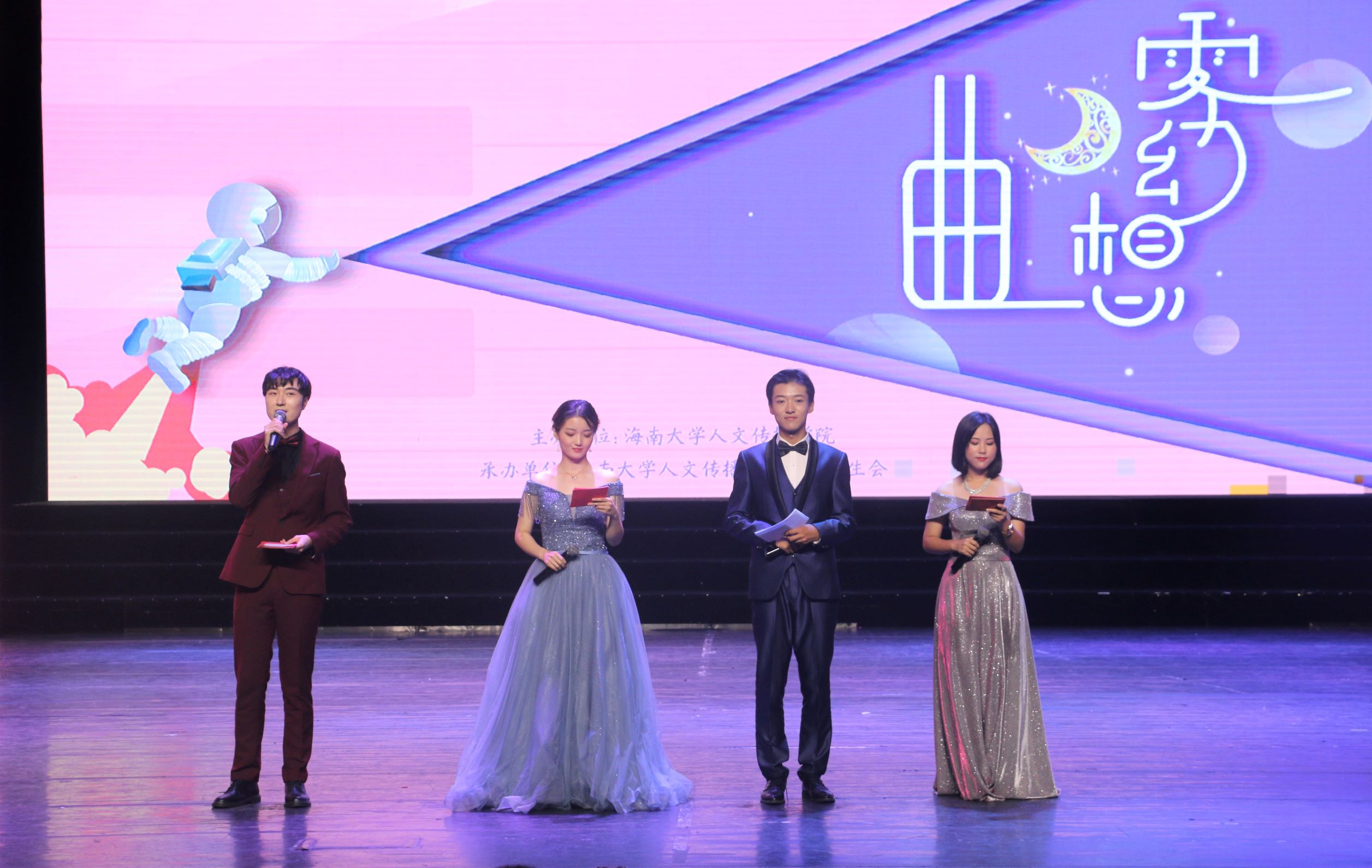 人文传播学院2019年“雾月幻想曲”主题迎新晚会在海甸校区思源学堂隆重举行。人文传播学院党委负责人邱华祥、人文传播学院党委副书记孙晓媛、学院团委书记公衍峰、学工办主任熊文军、学工办老师李润东、王嘉南、李洁、宋鸽及专业课老师颜磊、陈东亚出席此次迎新晚会。此次晚会分为“云天收夏色”“太空备忘记”“人间惊鸿客”三个篇章。