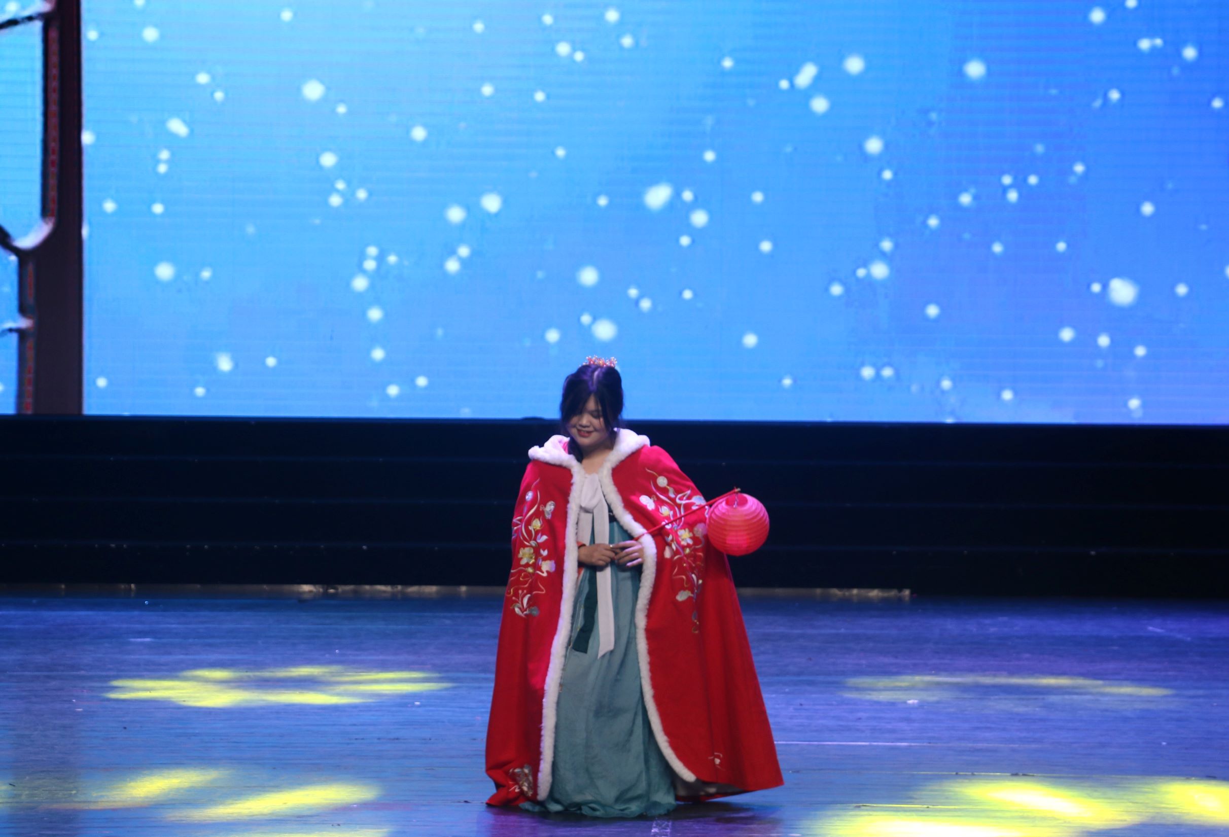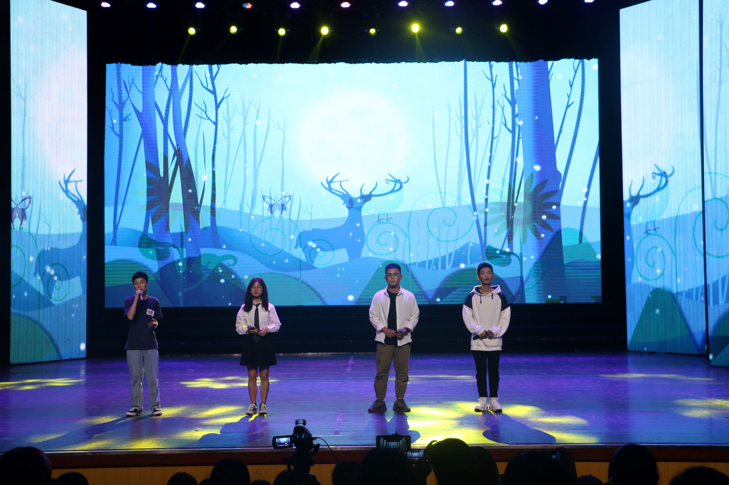 五彩灯下舞动青春,一曲《Adios》拉开了迎新晚会的序幕。开场舞过后,四位主持人上台隆重介绍了出席本次晚会的领导和嘉宾。在同学们热烈的掌声中,全场灯光熄灭,迎新晚会正式开始!演出首先进入第一篇章“云天收夏色”。兰冰洪同学用动人的歌声演绎一首《红玫瑰》,悠扬的旋律谱写着青春的绚烂。随后,符明超同学带来原创吉他演唱《听风吟》,汪宏伟、王景颖带来古风歌舞《大鱼》,这场视觉与听觉的盛宴让观众们赞不绝口、掌声连连。第一篇章结束后,主持人来到观众席进行抽奖环节,观众扫描屏幕上方的二维码参与抽奖,现场气氛十分活跃,最后幸运的获奖者也露出激动喜悦的笑容。