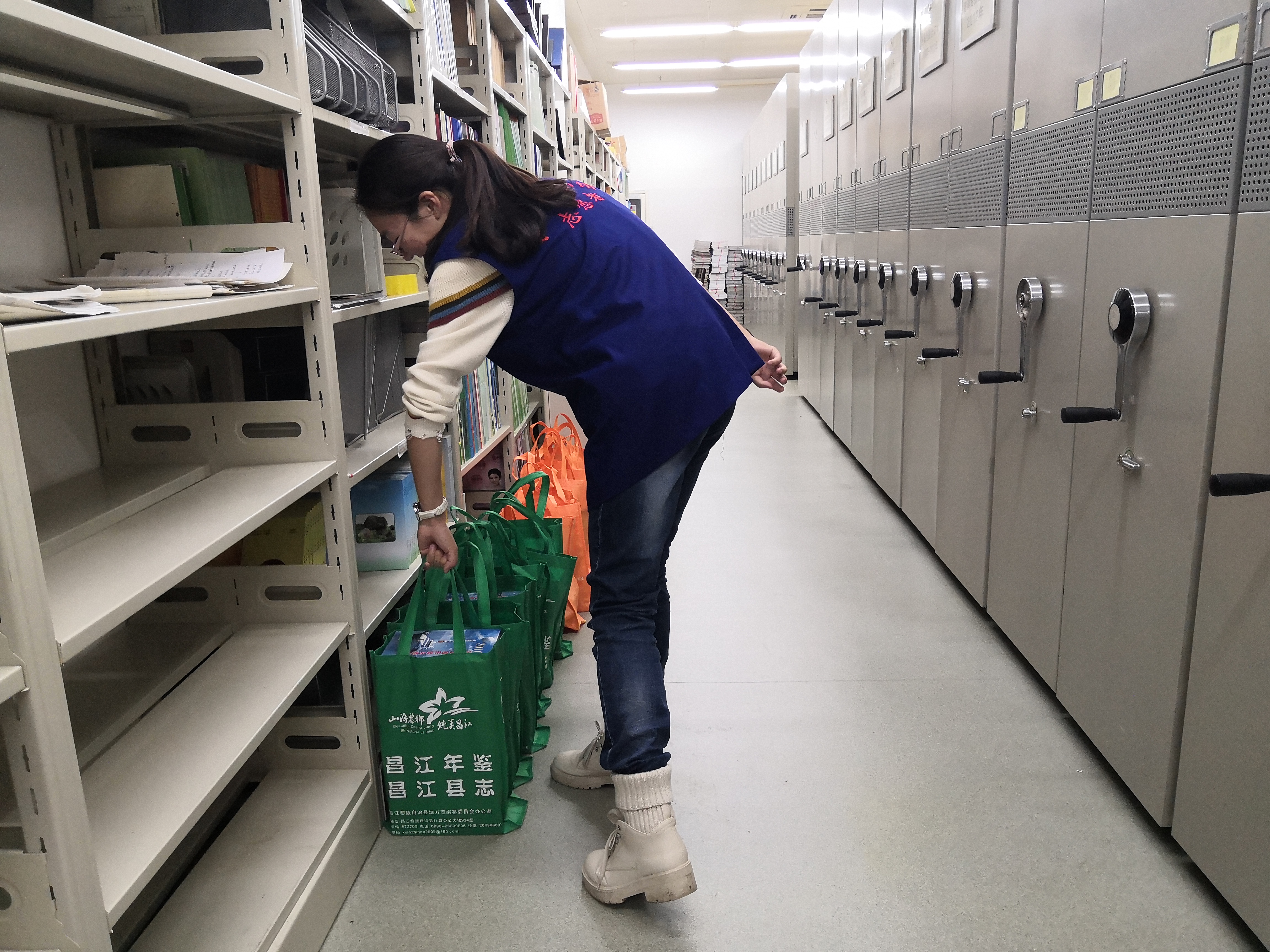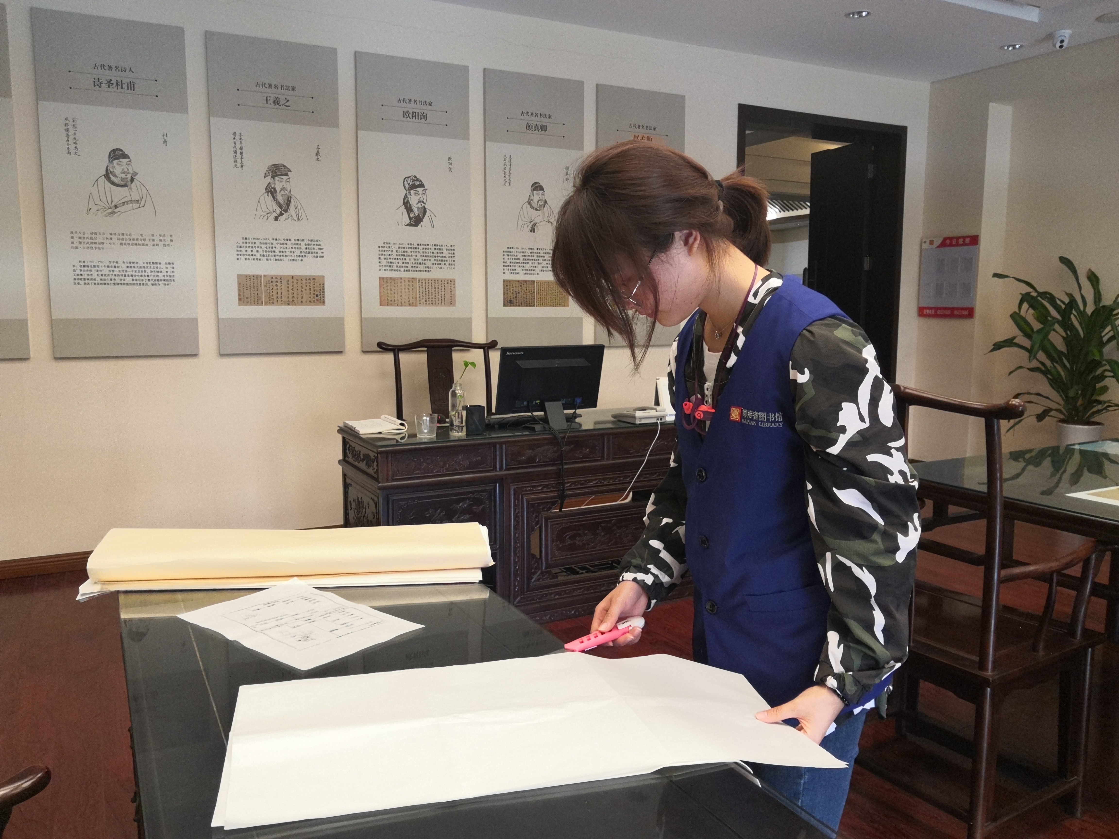 活动于下午三时正式开始。志愿者们根据任务安排,分成两组,分别前往古籍阅览室与地方文献区开始工作。在古籍阅览室里,一名志愿者细致地测量着纸张的大小,按尺寸裁剪纸张,以方便接下来文献拓印。而另外两名志愿者将拓印好的纸张分拣,挑选清晰的印刷成品,以方便装订成书。地方文献区内,一排排书墙分列两旁,两名志愿者对这些已经成册的书籍进行装书、封箱处理。志愿者轻轻拿起书本,放入准备好的纸箱或者布袋里,完成最后的封箱处理。