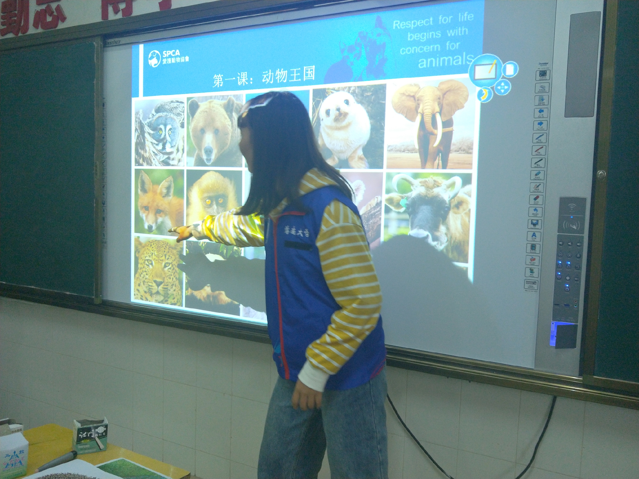 下午三点半活动正式开始。志愿者们经历了一路奔波却不显疲色,对当天的活动充满期待。孩子们看见熟悉的志愿者们也都十分兴奋,纷纷上前热情地和志愿者们打招呼,活动现场洋溢着欢快的气氛。志愿者们围绕“爱护动物,守护童心”的主题讲解与动物有关的知识,并且准备了精美的PPT和丰富的小礼物,受到了孩子们的欢迎。在简单而生动的介绍与讲解后,志愿者们和孩子们一起做起了小游戏,在宣传保护动物的重要性的同时,也大大拉近了与孩子们的距离,越来越多的孩子加入了游戏,现场一片其乐融融的景象。