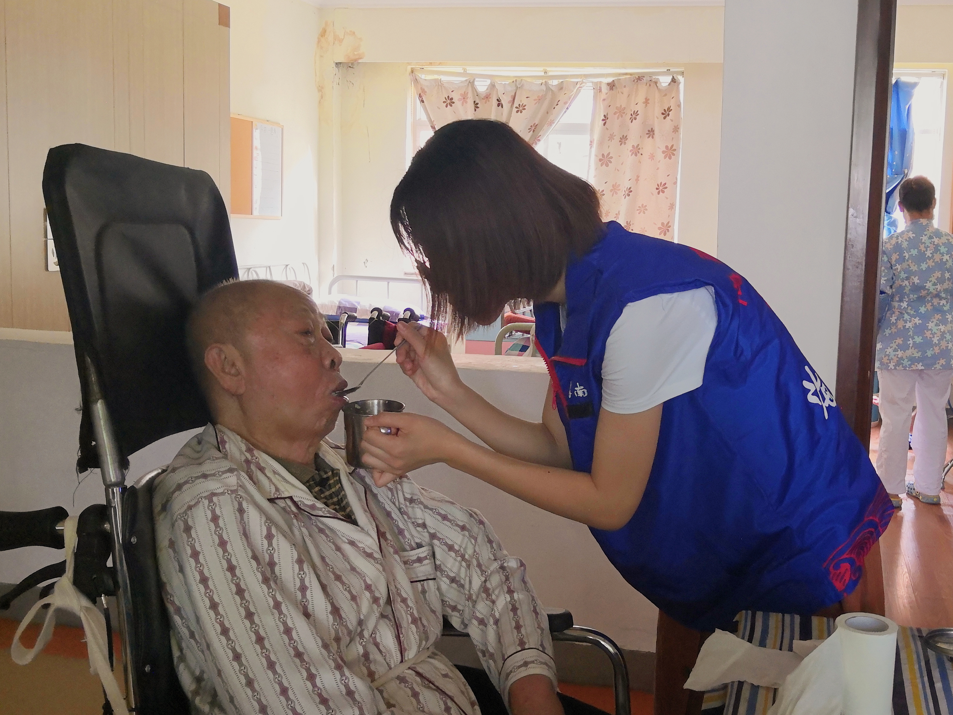 志愿者给老人喂水