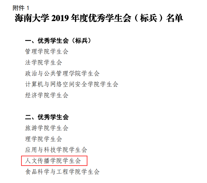 优秀学生会(标兵)、优秀学生会干部、优秀学生会主席的通知》,人文传播学院学生会积极组织开展评选工作。通过院学生会自评、互评和校学生会评选三个环节,人文传播学院学生会被评为2019年度优秀学生会。