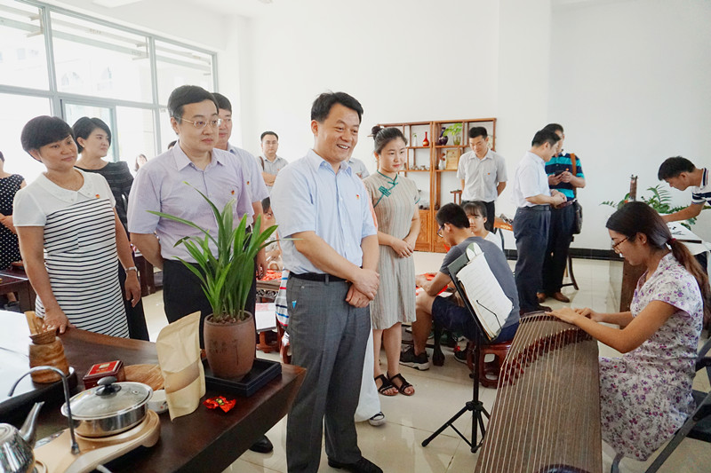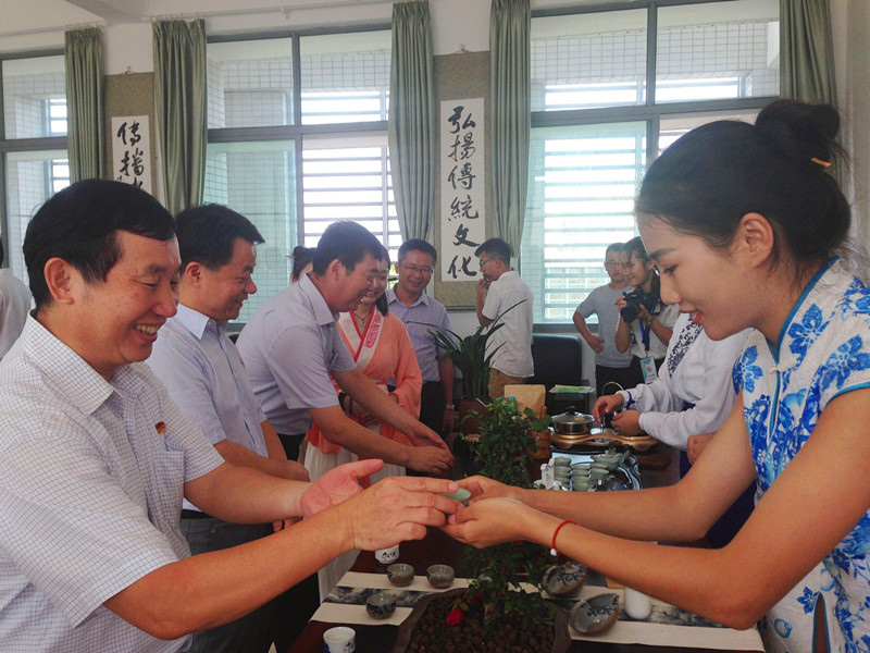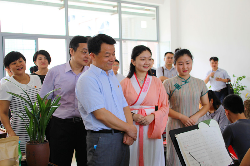 国学社,国学社内窗明几净,茶艺组社员现场为傅振邦书记一行展示了茶的冲泡过程,并按“以茶表敬意”的传统礼节向傅振邦书记一行客人奉上新泡制的香茗。傅振邦书记一行在国学社内还观看了由社团同学带来的古筝与箫的合奏表演、书法展示以及传统手工剪纸活动。观看期间,国学社社长张君怡同学向傅振邦书记一行详细介绍了社团建设及发展情况,傅振邦书记也十分关心国学社发展现状并详细询问社团情况,对国学社弘扬中华民族优秀传统文化,践行社会主义核心价值观的社团宗旨表示赞扬。