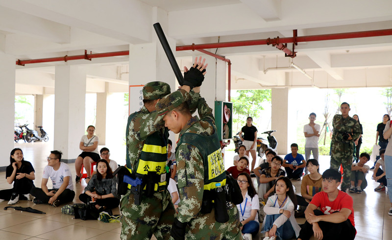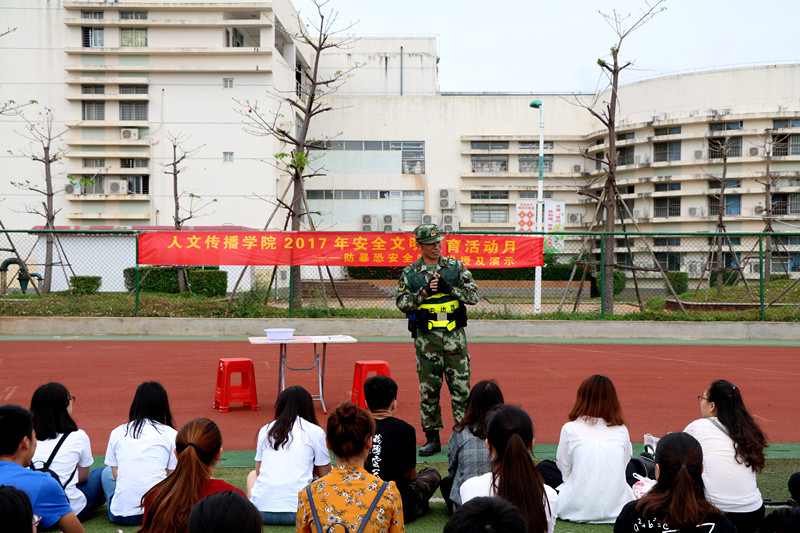 海甸校区第二田径场举办防暴恐安全知识讲座。活动邀请了武警海南省边防总队训练基地的文教官和他的三名同事担任讲师。团委书记熊文军老师和学工办李润东老师应邀参加了本次活动。 下午3点,防暴恐安全知识讲座正式开始。首先,文教官以新疆暴恐事件引起的再测失踪人口数量庞大为切入点,向大家说明了暴恐事件的巨大危害和增强防暴恐意识的重要性。接着,他又以英国中心议会大厦暴恐事件和天安门金水桥暴恐事件为例,向同学们介绍了暴恐事件的基本形式并分析了暴恐分子作案时的心理状态和基本手法。随后,各位教官利用塑料棒,矿泉水瓶等道具为大家亲自展示了近身缠斗等自我保护的措施。文教官表示,当暴恐来临时,同学们应当牢记“跑,躲,反抗”这三要素,同学们由于自身体力不如歹徒,应当以“跑”和“躲”为主,尽可能避免和歹徒的正面接触。在教官演示期间,同学们认真聆听教官的讲解并积极学习相关反抗动作。最后,文教官为大家总结了关于校园防恐防暴的要点,期望通过今天的讲解,同学们的防暴恐意识可以有所提高。 本次防暴恐安全知识讲座,不仅使同学们对反恐防暴的重要性有了更深层次的理解,还提高了同学们的防暴恐安全意识和自我保护的能力,也对做好校园防暴恐突发事件的应急反应工作给予了很大的帮助。