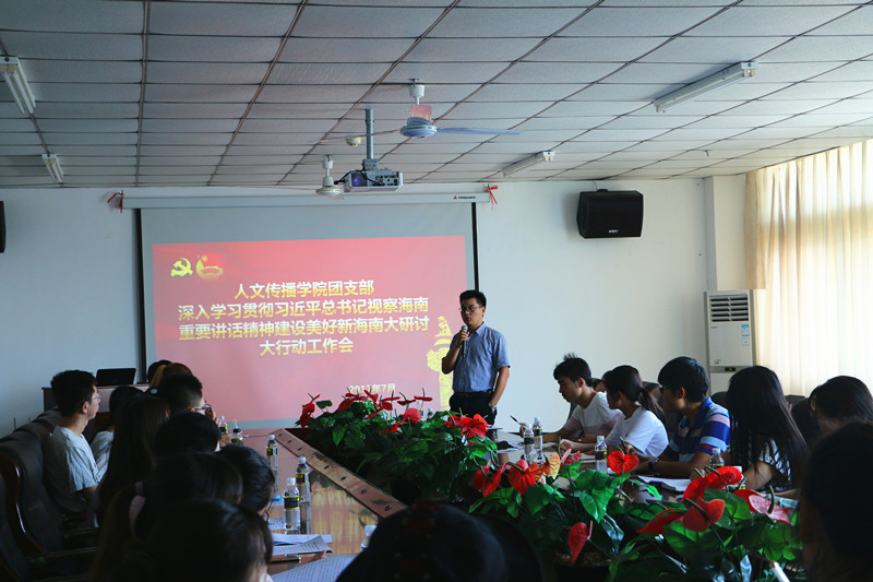 2017年7月5日下午三点,人文传播学院团支部深入学习贯彻习近平总书记视察海南时的重要讲话精神建设美好新海南“大研讨大行动”工作会在海甸校区社科楼B719会议室召开。学院团委熊文军老师,学工办李润东老师,团委学生干部、15-16级各团支部书记参加会议。